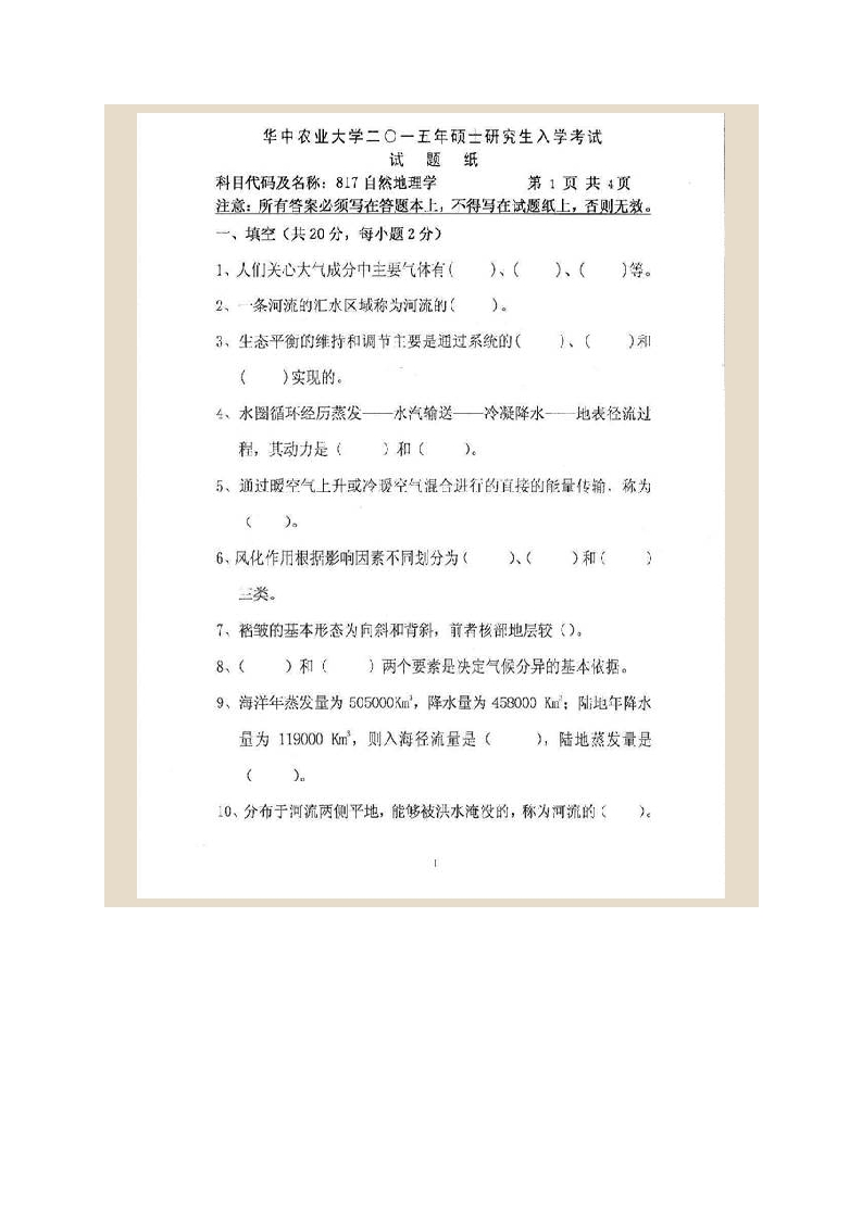 华中农业大学资源环境学院817自然地理学历年考研真题汇编