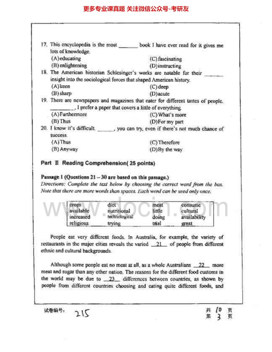 华中科技大学245英语2002-2007考研真题汇编.Image.Marked猴哥6个月前发布关注私信40.82MB88页05052华中科技大学245英语2002-2007考研真题汇编.Image.Marked此内容为免费资源,请登录后查看¥0 登录查看免费资源 第1页 / 共88页 第2页 / 共88页 第3页 / 共88页 该文档为免费文档,您可直接下载完整版进行阅读 © 版权声明文章版权归作者所有,未经允许请勿转载。THE END考研专业课 喜欢就支持一下吧点赞52赞赏 分享QQ空间微博QQ好友海报分享复制链接收藏