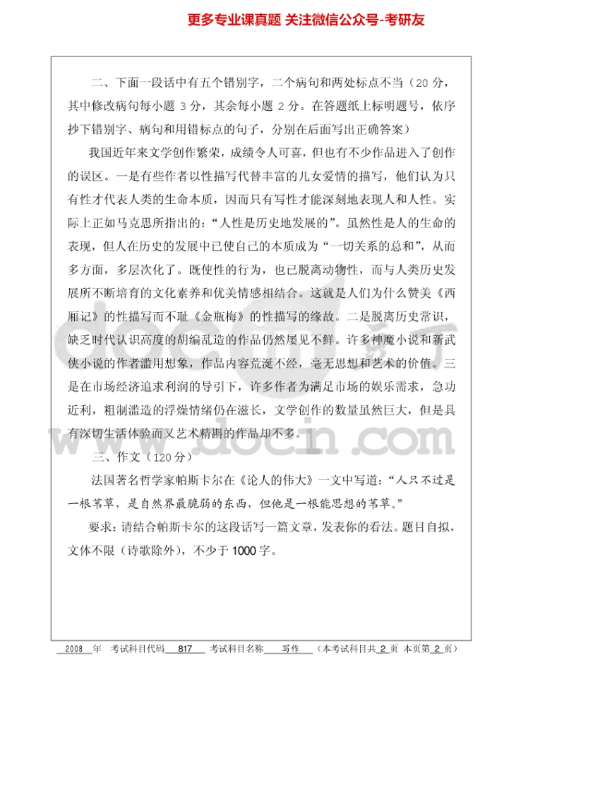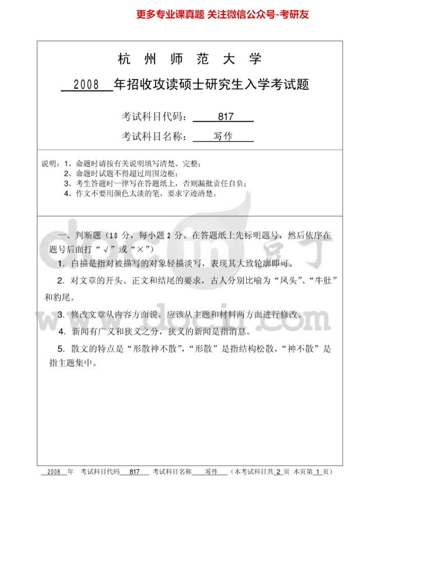 杭州师范大学814写作考研真题汇编猴哥6个月前发布关注私信1.39MB16页04123杭州师范大学814写作考研真题汇编此内容为免费资源,请登录后查看¥0 登录查看免费资源 第1页 / 共16页 第2页 / 共16页 第3页 / 共16页 该文档为免费文档,您可直接下载完整版进行阅读 © 版权声明文章版权归作者所有,未经允许请勿转载。THE END《杭州师范大学》(814)管理科学基础考研资料考研专业课 喜欢就支持一下吧点赞23赞赏 分享QQ空间微博QQ好友海报分享复制链接收藏