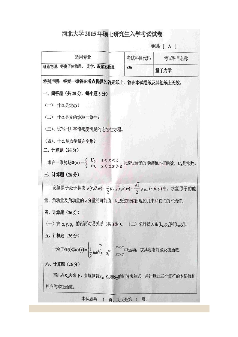 河北大学物理科学与技术学院836量子力学历年考研真题汇编