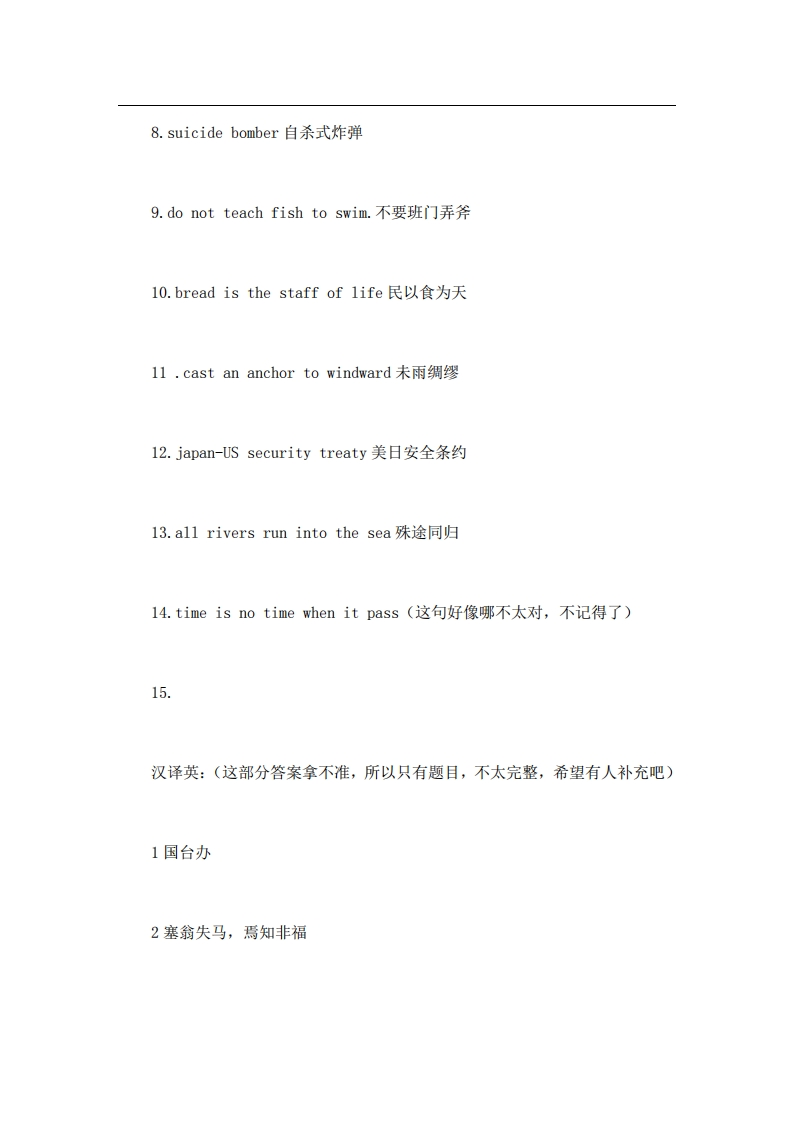 海南大学357英语翻译基础2013年考研试题(回忆版)_1猴哥6个月前发布关注私信0.17MB5页03446海南大学357英语翻译基础2013年考研试题(回忆版)_1此内容为免费资源,请登录后查看¥0 登录查看免费资源 第1页 / 共5页 第2页 / 共5页 第3页 / 共5页 该文档为免费文档,您可直接下载完整版进行阅读 © 版权声明文章版权归作者所有,未经允许请勿转载。THE END《海南大学》(357)英语翻译基础考研资料考研专业课 喜欢就支持一下吧点赞46赞赏 分享QQ空间微博QQ好友海报分享复制链接收藏