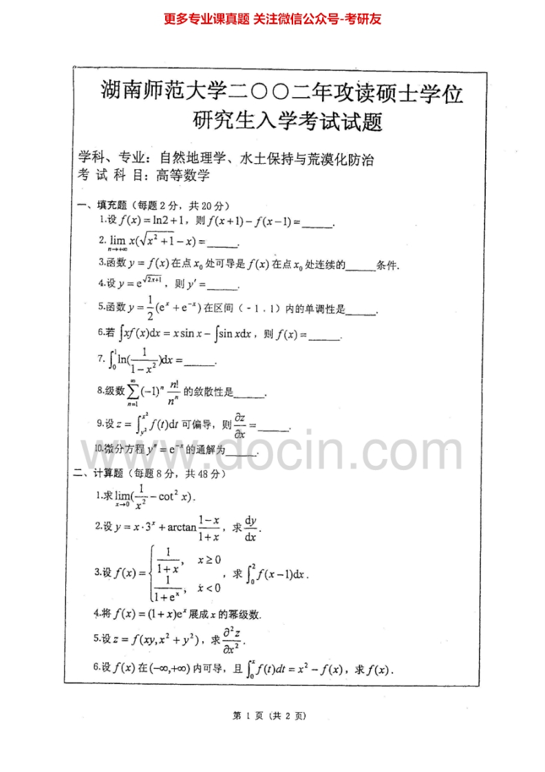 湖南师范大学高等数学历年真题2001-2003、2005-2007考研真题汇编.Image.Marked猴哥6个月前发布关注私信3.91MB14页03821湖南师范大学高等数学历年真题2001-2003、2005-2007考研真题汇编.Image.Marked此内容为免费资源,请登录后查看¥0 登录查看免费资源 第1页 / 共14页 第2页 / 共14页 第3页 / 共14页 该文档为免费文档,您可直接下载完整版进行阅读 © 版权声明文章版权归作者所有,未经允许请勿转载。THE END考研专业课 喜欢就支持一下吧点赞21赞赏 分享QQ空间微博QQ好友海报分享复制链接收藏