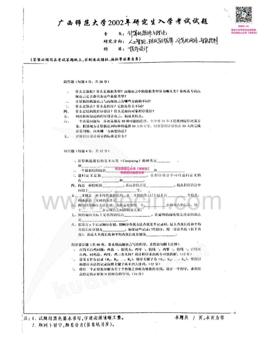 广西师范大学881程序设计基础2001-2002考研真题汇编猴哥6个月前发布关注私信0.73MB2页06527广西师范大学881程序设计基础2001-2002考研真题汇编此内容为免费资源,请登录后查看¥0 登录查看免费资源 第1页 / 共2页 第2页 / 共2页 已完成全部阅读,共2页 © 版权声明文章版权归作者所有,未经允许请勿转载。THE END考研专业课 喜欢就支持一下吧点赞27赞赏 分享QQ空间微博QQ好友海报分享复制链接收藏