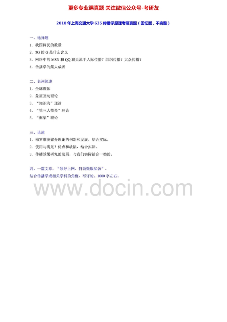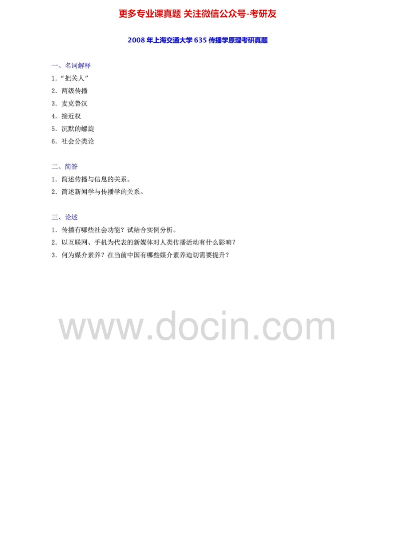 上海交通大学635传播学原理2004-2008、2010、2013考研真题汇编.Image.Marked_1753610723猴哥6个月前发布关注私信1MB7页09762上海交通大学635传播学原理2004-2008、2010、2013考研真题汇编.Image.Marked_1753610723此内容为免费资源,请登录后查看¥0 登录查看免费资源 第1页 / 共7页 第2页 / 共7页 第3页 / 共7页 该文档为免费文档,您可直接下载完整版进行阅读 © 版权声明文章版权归作者所有,未经允许请勿转载。THE END《上海交通大学》(635)传播理论考研资料考研专业课 喜欢就支持一下吧点赞62赞赏 分享QQ空间微博QQ好友海报分享复制链接收藏