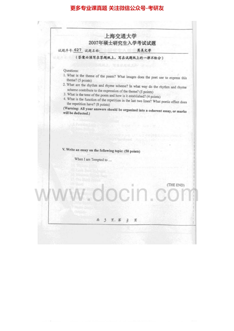 上海交通大学627英美文学2002-2007考研真题汇编.Image.Marked_1753610723猴哥6个月前发布关注私信3.45MB19页03041上海交通大学627英美文学2002-2007考研真题汇编.Image.Marked_1753610723此内容为免费资源,请登录后查看¥0 登录查看免费资源 第1页 / 共19页 第2页 / 共19页 第3页 / 共19页 该文档为免费文档,您可直接下载完整版进行阅读 © 版权声明文章版权归作者所有,未经允许请勿转载。THE END《上海交通大学》(753)基础医学综合考研资料考研专业课 喜欢就支持一下吧点赞41赞赏 分享QQ空间微博QQ好友海报分享复制链接收藏