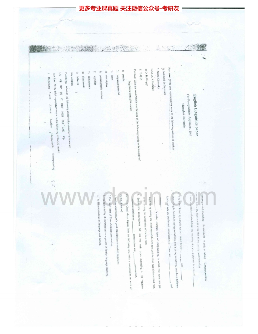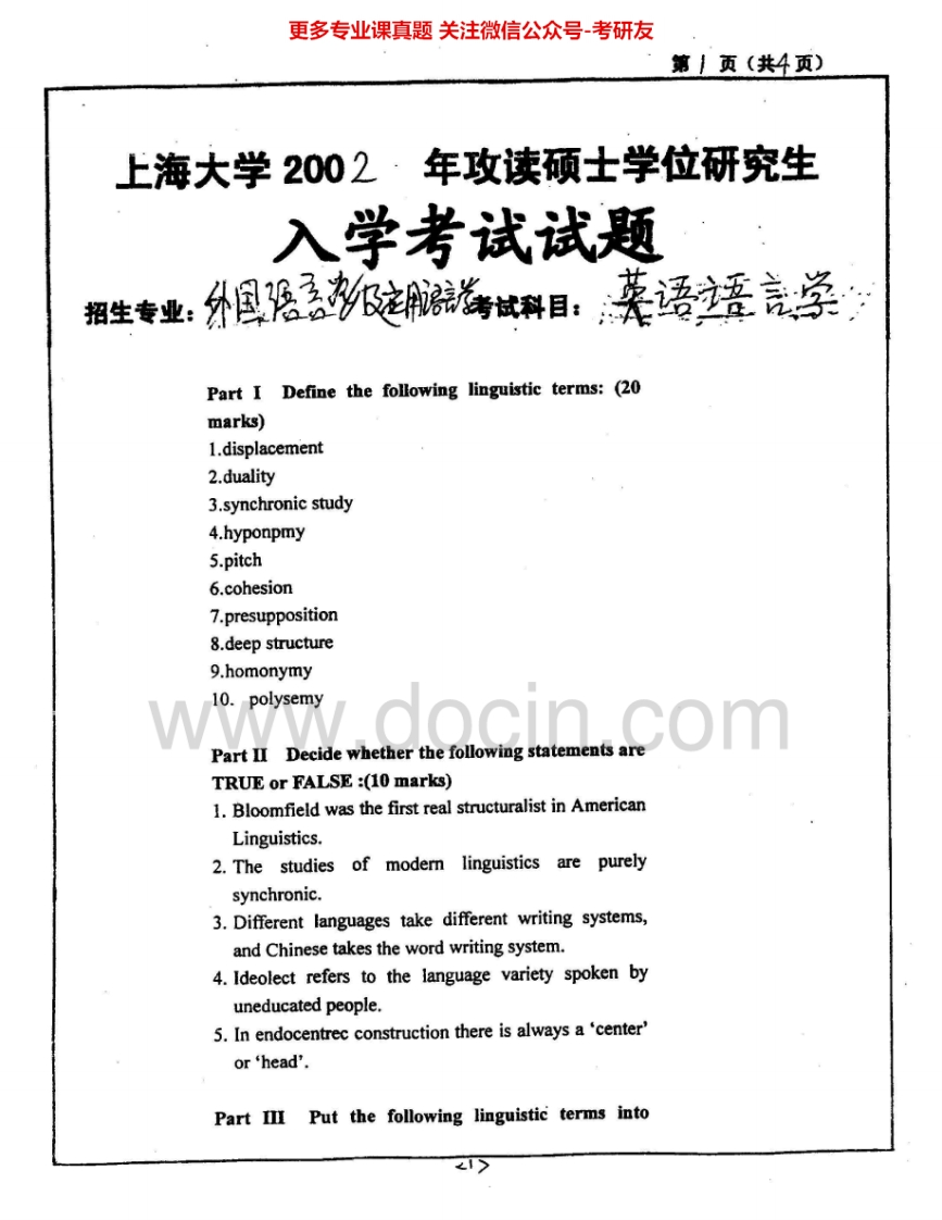 上海大学623英语语言学2000-2003考研真题汇编.Image.Marked猴哥6个月前发布关注私信2.69MB9页05762上海大学623英语语言学2000-2003考研真题汇编.Image.Marked此内容为免费资源,请登录后查看¥0 登录查看免费资源 第1页 / 共9页 第2页 / 共9页 第3页 / 共9页 该文档为免费文档,您可直接下载完整版进行阅读 © 版权声明文章版权归作者所有,未经允许请勿转载。THE END考研专业课 喜欢就支持一下吧点赞62赞赏 分享QQ空间微博QQ好友海报分享复制链接收藏