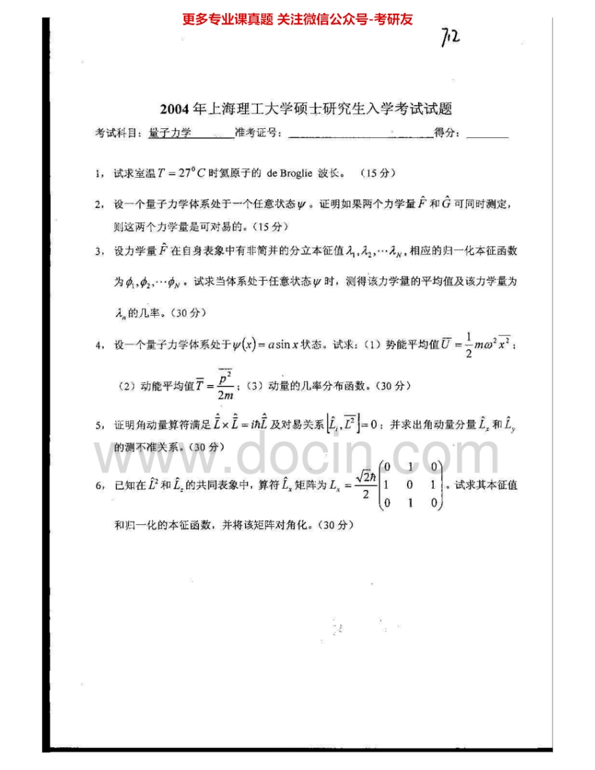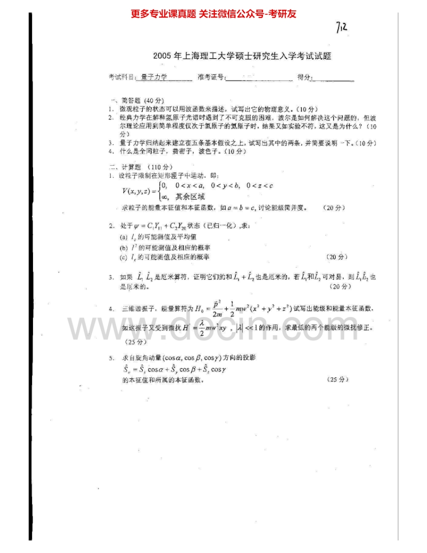 上海理工大学829量子力学2003-2005、2007考研真题汇编.Image.Marked猴哥6个月前发布关注私信0.82MB4页05131上海理工大学829量子力学2003-2005、2007考研真题汇编.Image.Marked此内容为免费资源,请登录后查看¥0 登录查看免费资源 第1页 / 共4页 第2页 / 共4页 第3页 / 共4页 该文档为免费文档,您可直接下载完整版进行阅读 © 版权声明文章版权归作者所有,未经允许请勿转载。THE END《上海理工大学》(829)量子力学考研资料考研专业课 喜欢就支持一下吧点赞31赞赏 分享QQ空间微博QQ好友海报分享复制链接收藏