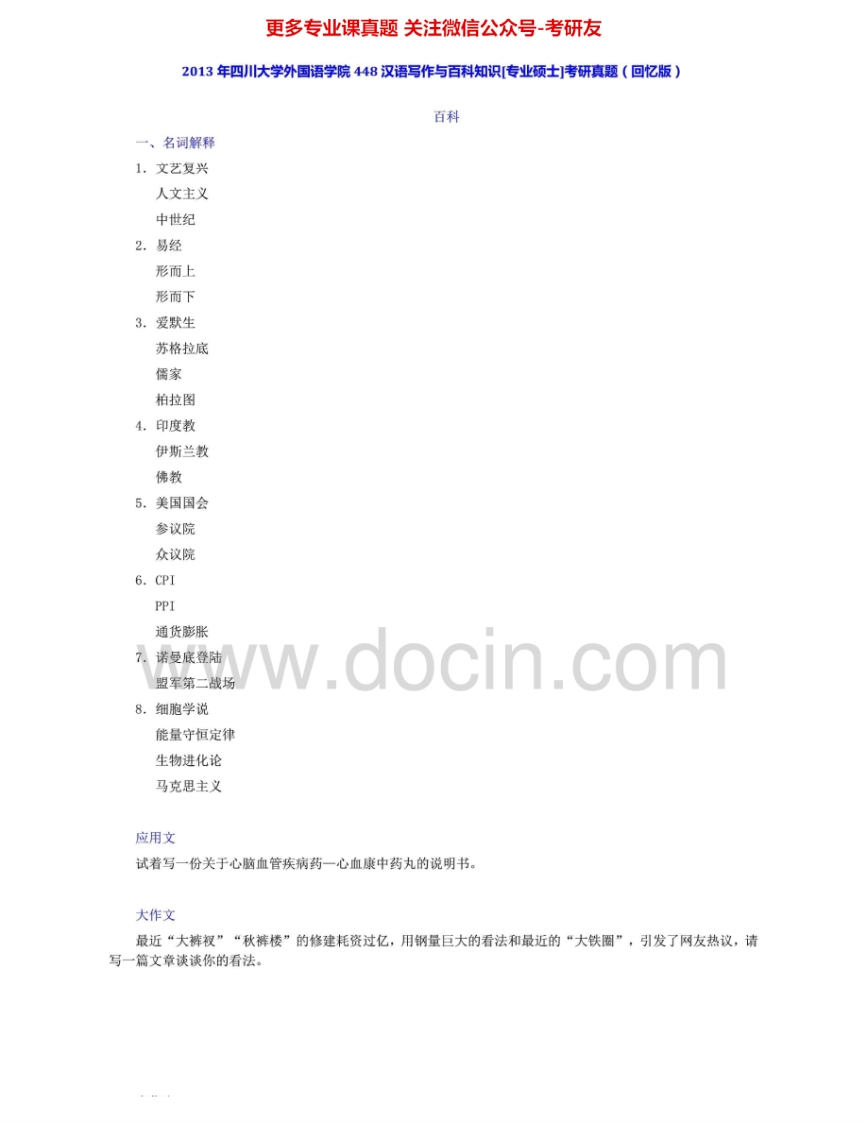 四川大学448汉语写作与百科知识2010-2015其中2010、2013有答案考研真题汇编.Image.Marked猴哥6个月前发布关注私信7.41MB23页09017四川大学448汉语写作与百科知识2010-2015其中2010、2013有答案考研真题汇编.Image.Marked此内容为免费资源,请登录后查看¥0 登录查看免费资源 第1页 / 共23页 第2页 / 共23页 第3页 / 共23页 该文档为免费文档,您可直接下载完整版进行阅读 © 版权声明文章版权归作者所有,未经允许请勿转载。THE END《四川大学》(448)汉语写作与百科知识考研资料考研专业课 喜欢就支持一下吧点赞17赞赏 分享QQ空间微博QQ好友海报分享复制链接收藏