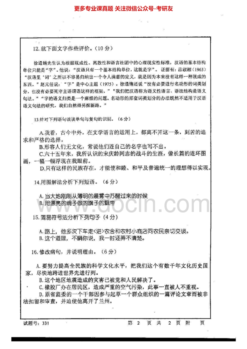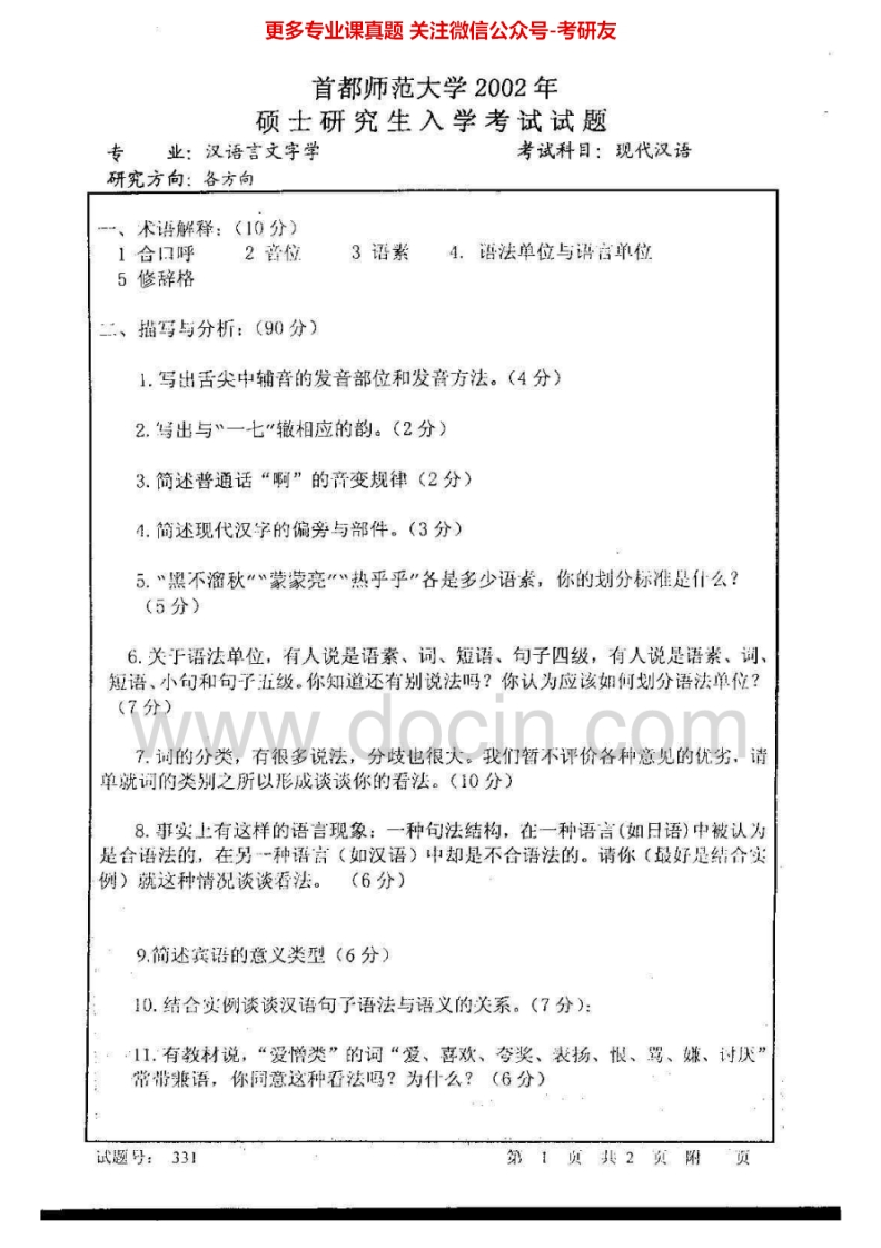 首都师范大学中国语言文学现代汉语历年真题现代汉语2001-2011考研真题汇编.Image.Marked猴哥6个月前发布关注私信4.55MB15页09062首都师范大学中国语言文学现代汉语历年真题现代汉语2001-2011考研真题汇编.Image.Marked此内容为免费资源,请登录后查看¥0 登录查看免费资源 第1页 / 共15页 第2页 / 共15页 第3页 / 共15页 该文档为免费文档,您可直接下载完整版进行阅读 © 版权声明文章版权归作者所有,未经允许请勿转载。THE END考研专业课 喜欢就支持一下吧点赞62赞赏 分享QQ空间微博QQ好友海报分享复制链接收藏