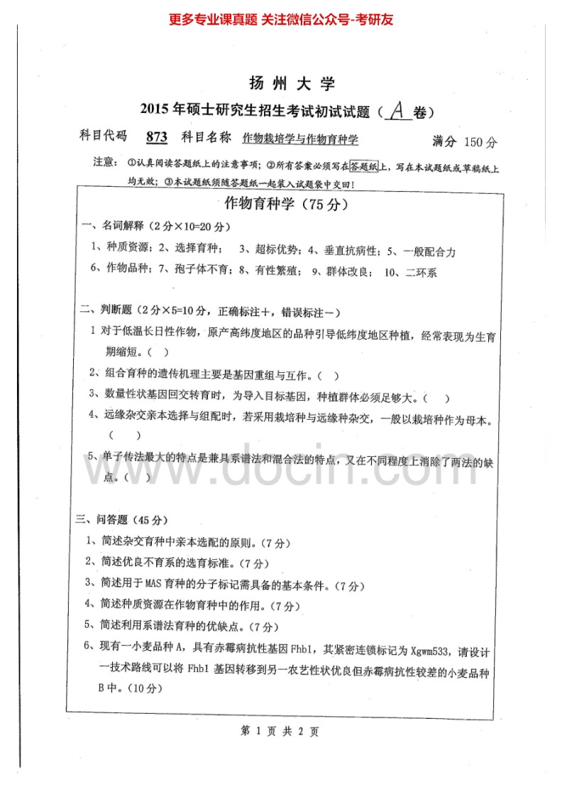扬州大学873作物栽培学与作物育种学2014-2015考研真题汇编.Image.Marked