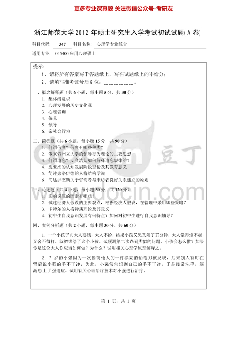 浙江师范大学347心理学专业综合2011-2013考研真题汇编猴哥6个月前发布关注私信0.86MB5页09127浙江师范大学347心理学专业综合2011-2013考研真题汇编此内容为免费资源,请登录后查看¥0 登录查看免费资源 第1页 / 共5页 第2页 / 共5页 第3页 / 共5页 该文档为免费文档,您可直接下载完整版进行阅读 © 版权声明文章版权归作者所有,未经允许请勿转载。THE END《浙江师范大学》(347)心理学专业综合考研资料考研专业课 喜欢就支持一下吧点赞27赞赏 分享QQ空间微博QQ好友海报分享复制链接收藏