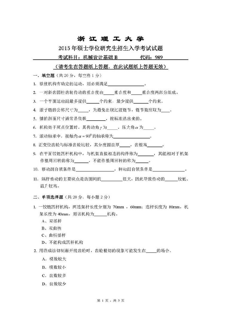 浙江理工大学机械与自动控制学院989机械设计基础B[专业硕士]历年考研真题汇编
