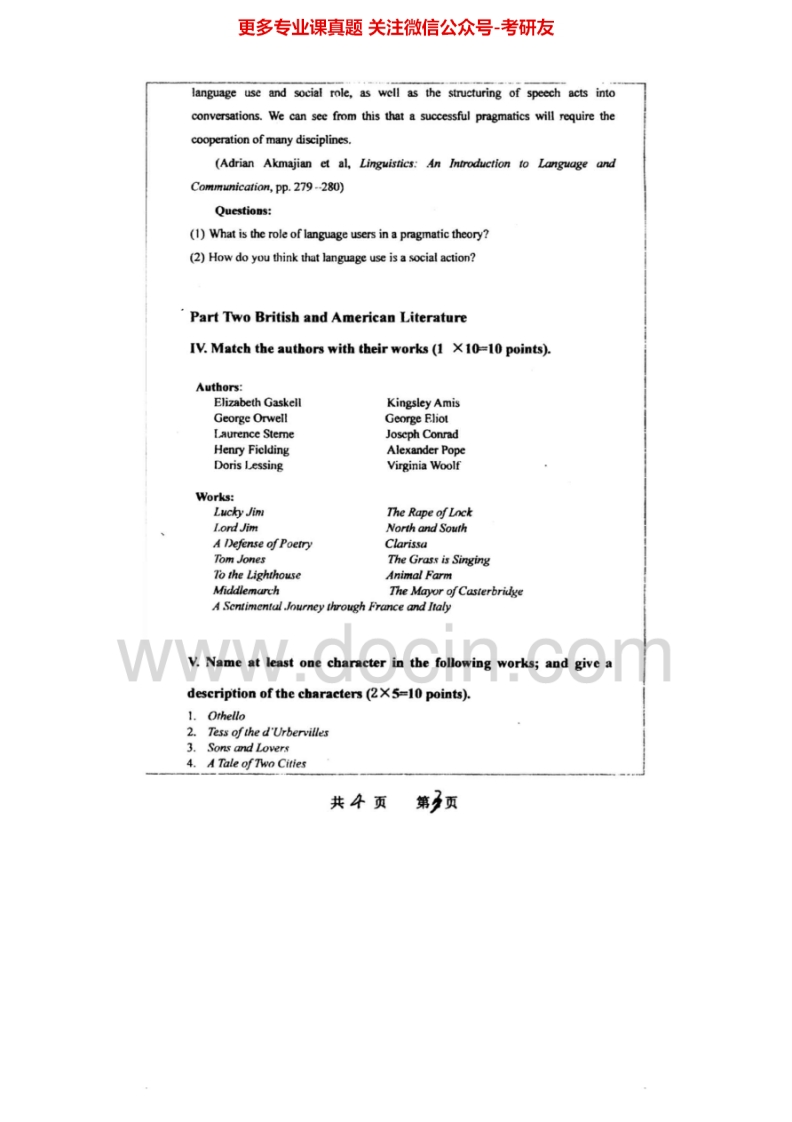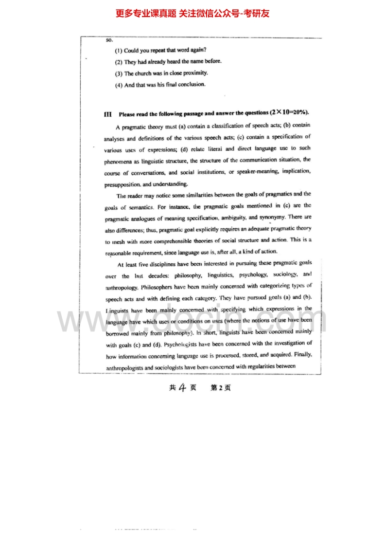 武汉大学806英语综合(语言学基础、西方文化、翻译)2006-2014考研真题汇编.Image.Marked猴哥6个月前发布关注私信8.77MB39页06228武汉大学806英语综合(语言学基础、西方文化、翻译)2006-2014考研真题汇编.Image.Marked此内容为免费资源,请登录后查看¥0 登录查看免费资源 第1页 / 共39页 第2页 / 共39页 第3页 / 共39页 该文档为免费文档,您可直接下载完整版进行阅读 © 版权声明文章版权归作者所有,未经允许请勿转载。THE END考研专业课 喜欢就支持一下吧点赞28赞赏 分享QQ空间微博QQ好友海报分享复制链接收藏