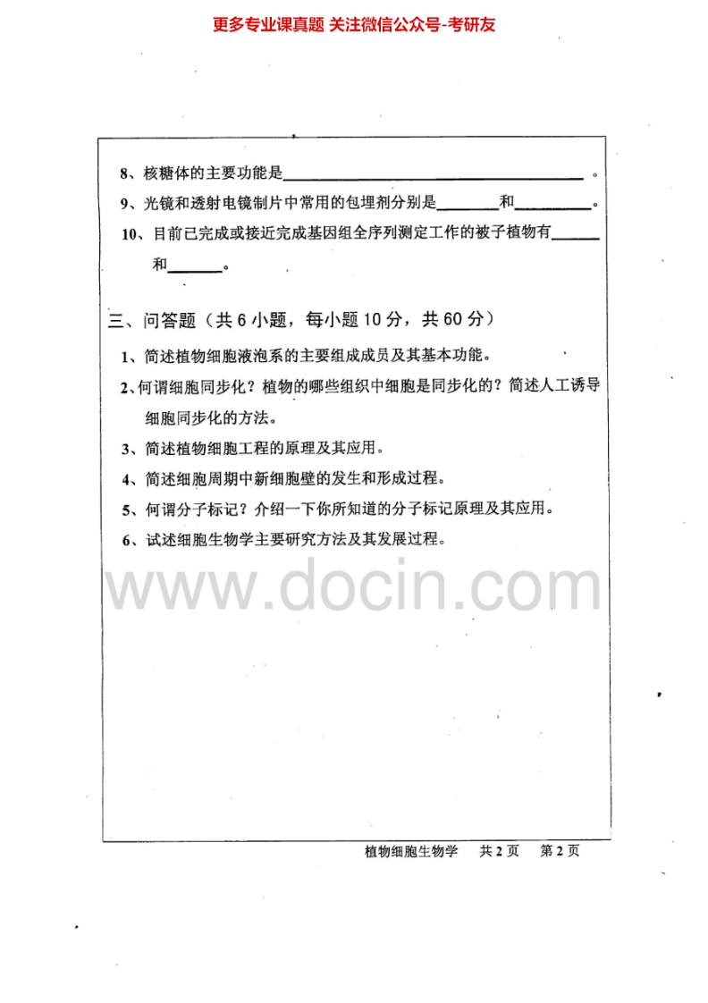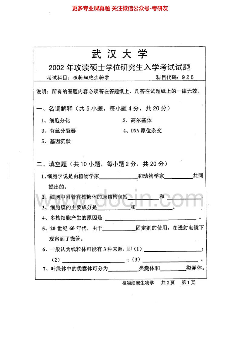 武汉大学植物分子生物学2002、植物细胞生物学2002考研真题汇编.Image.Marked猴哥6个月前发布关注私信0.51MB3页06535武汉大学植物分子生物学2002、植物细胞生物学2002考研真题汇编.Image.Marked此内容为免费资源,请登录后查看¥0 登录查看免费资源 第1页 / 共3页 第2页 / 共3页 第3页 / 共3页 已完成全部阅读,共3页 © 版权声明文章版权归作者所有,未经允许请勿转载。THE END考研专业课 喜欢就支持一下吧点赞35赞赏 分享QQ空间微博QQ好友海报分享复制链接收藏