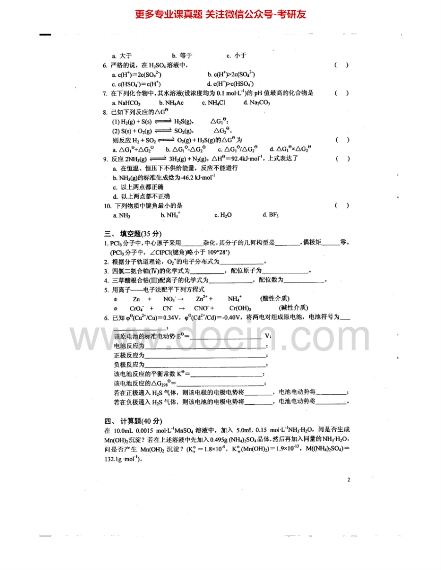 武汉理工大学623无机化学2002-2010考研真题汇编.Image.Marked猴哥6个月前发布关注私信9.34MB38页08237武汉理工大学623无机化学2002-2010考研真题汇编.Image.Marked此内容为免费资源,请登录后查看¥0 登录查看免费资源 第1页 / 共38页 第2页 / 共38页 第3页 / 共38页 该文档为免费文档,您可直接下载完整版进行阅读 © 版权声明文章版权归作者所有,未经允许请勿转载。THE END考研专业课 喜欢就支持一下吧点赞37赞赏 分享QQ空间微博QQ好友海报分享复制链接收藏