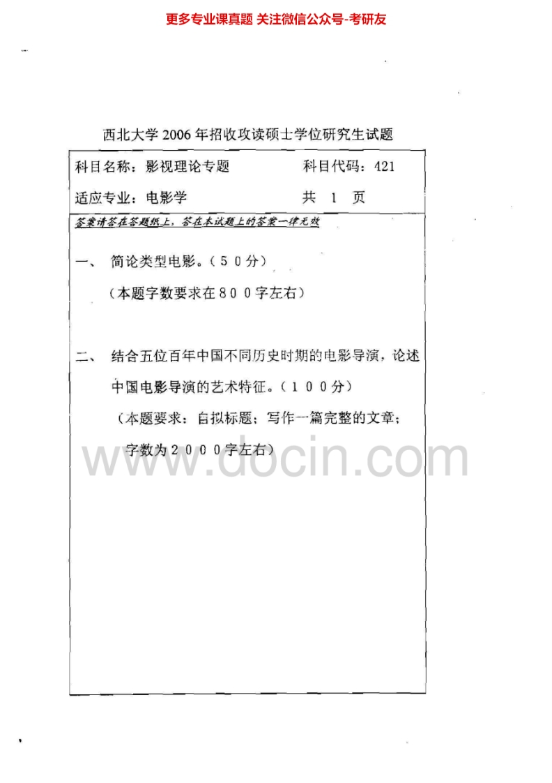 西北大学812影视理论专题2005-2006考研真题汇编.Image.Marked猴哥6个月前发布关注私信0.58MB2页07848西北大学812影视理论专题2005-2006考研真题汇编.Image.Marked此内容为免费资源,请登录后查看¥0 登录查看免费资源 第1页 / 共2页 第2页 / 共2页 已完成全部阅读,共2页 © 版权声明文章版权归作者所有,未经允许请勿转载。THE END《西北大学》(812)电影史论专题考研资料考研专业课 喜欢就支持一下吧点赞48赞赏 分享QQ空间微博QQ好友海报分享复制链接收藏