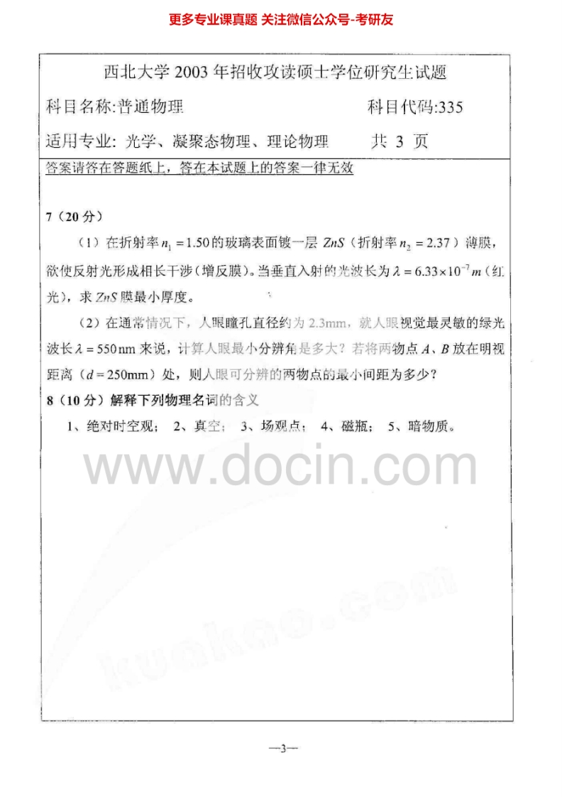 西北大学普通物理2003-2006考研真题汇编猴哥6个月前发布关注私信6.11MB17页04959西北大学普通物理2003-2006考研真题汇编此内容为免费资源,请登录后查看¥0 登录查看免费资源 第1页 / 共17页 第2页 / 共17页 第3页 / 共17页 该文档为免费文档,您可直接下载完整版进行阅读 © 版权声明文章版权归作者所有,未经允许请勿转载。THE END考研专业课 喜欢就支持一下吧点赞59赞赏 分享QQ空间微博QQ好友海报分享复制链接收藏