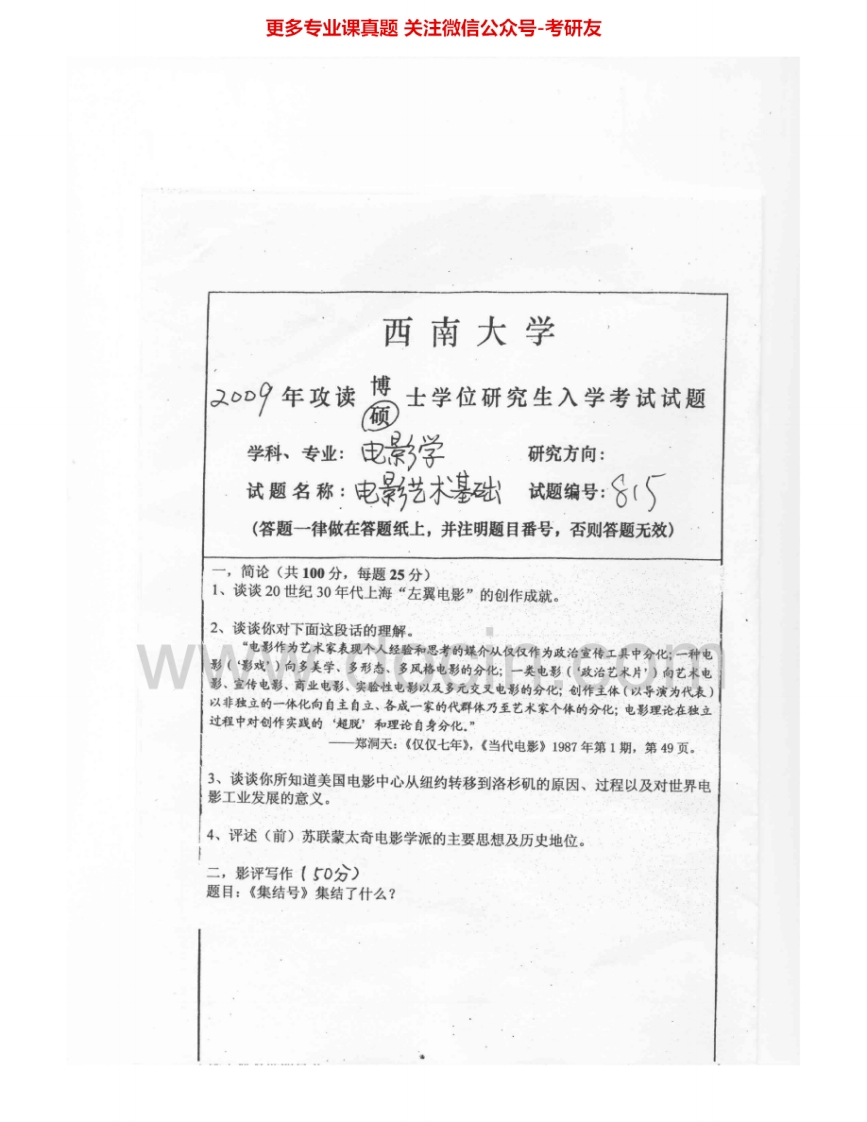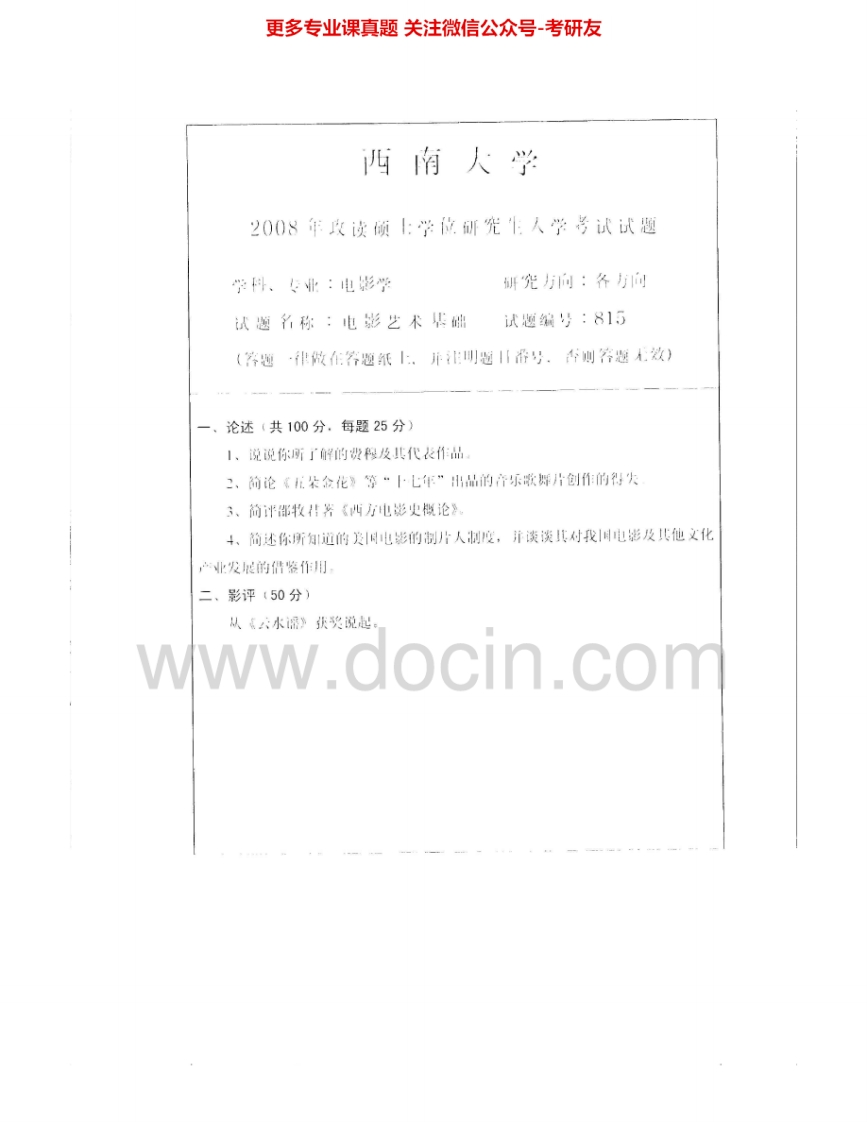 西南大学815电影艺术基础2006、2008-2010考研真题汇编.Image.Marked猴哥6个月前发布关注私信0.73MB4页04419西南大学815电影艺术基础2006、2008-2010考研真题汇编.Image.Marked此内容为免费资源,请登录后查看¥0 登录查看免费资源 第1页 / 共4页 第2页 / 共4页 第3页 / 共4页 该文档为免费文档,您可直接下载完整版进行阅读 © 版权声明文章版权归作者所有,未经允许请勿转载。THE END考研专业课 喜欢就支持一下吧点赞19赞赏 分享QQ空间微博QQ好友海报分享复制链接收藏