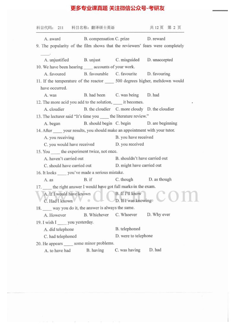 西南科技大学211翻译硕士英语2011-2012、2015考研真题汇编.Image.Marked猴哥6个月前发布关注私信11.39MB63页06932西南科技大学211翻译硕士英语2011-2012、2015考研真题汇编.Image.Marked此内容为免费资源,请登录后查看¥0 登录查看免费资源 第1页 / 共63页 第2页 / 共63页 第3页 / 共63页 该文档为免费文档,您可直接下载完整版进行阅读 © 版权声明文章版权归作者所有,未经允许请勿转载。THE END考研专业课 喜欢就支持一下吧点赞32赞赏 分享QQ空间微博QQ好友海报分享复制链接收藏