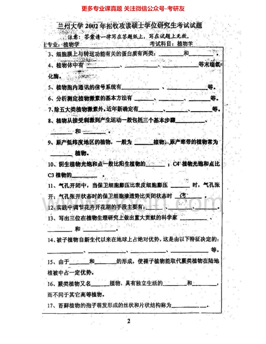 兰州大学414植物生理学与生物化学:植物生理学02-05、07-09生物化学02-04、07考研真题汇编.Image.Marked猴哥6个月前发布关注私信9.54MB33页07212兰州大学414植物生理学与生物化学:植物生理学02-05、07-09生物化学02-04、07考研真题汇编.Image.Marked此内容为免费资源,请登录后查看¥0 登录查看免费资源 第1页 / 共33页 第2页 / 共33页 第3页 / 共33页 该文档为免费文档,您可直接下载完整版进行阅读 © 版权声明文章版权归作者所有,未经允许请勿转载。THE END考研专业课 喜欢就支持一下吧点赞12赞赏 分享QQ空间微博QQ好友海报分享复制链接收藏