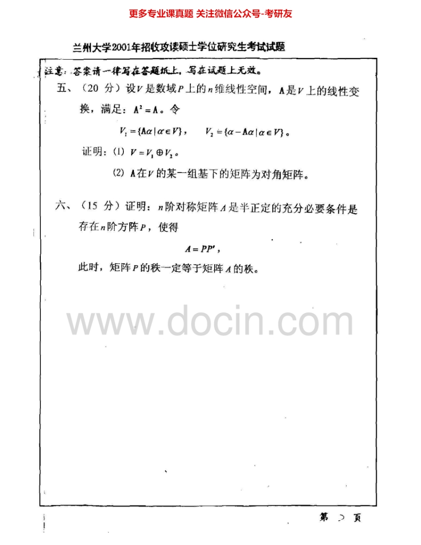 兰州大学801高等代数2001-2011其中2011有答案考研真题汇编.Image.Marked