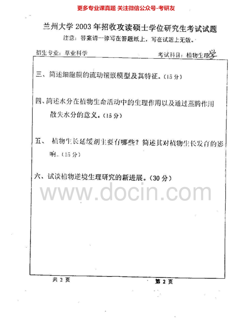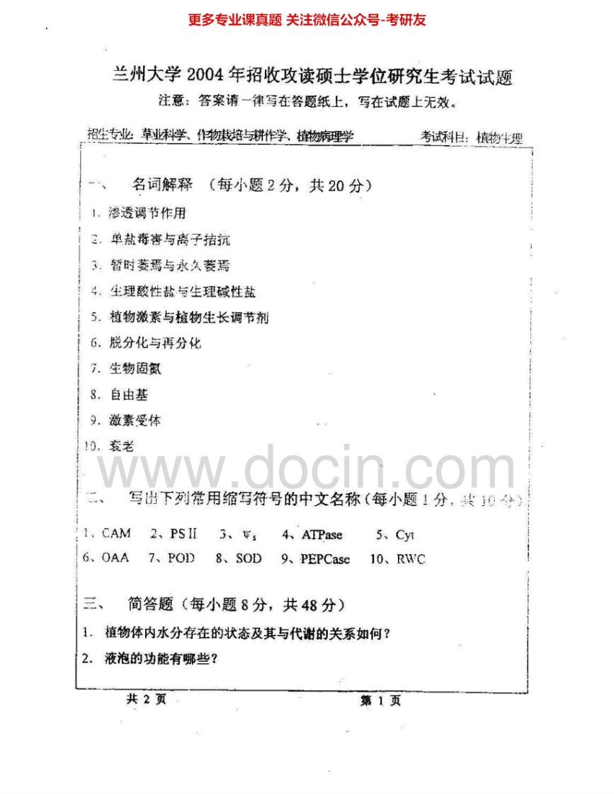 兰州大学828植物生理学2003-2005、2007-2009考研真题汇编.Image.Marked猴哥6个月前发布关注私信1.61MB8页03824兰州大学828植物生理学2003-2005、2007-2009考研真题汇编.Image.Marked此内容为免费资源,请登录后查看¥0 登录查看免费资源 第1页 / 共8页 第2页 / 共8页 第3页 / 共8页 该文档为免费文档,您可直接下载完整版进行阅读 © 版权声明文章版权归作者所有,未经允许请勿转载。THE END《兰州大学》(828)植物学考研资料考研专业课 喜欢就支持一下吧点赞24赞赏 分享QQ空间微博QQ好友海报分享复制链接收藏