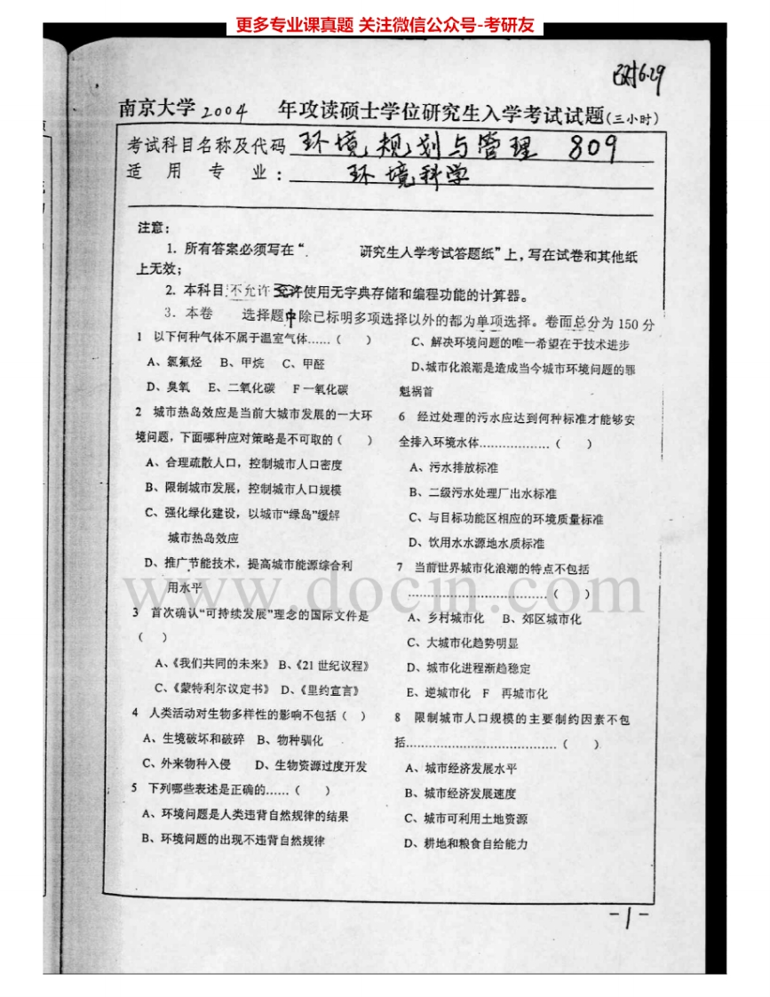 南京大学809环境规划与管理2004-2009考研真题汇编.Image.Marked-学习资源网 - 分享优质学习资料