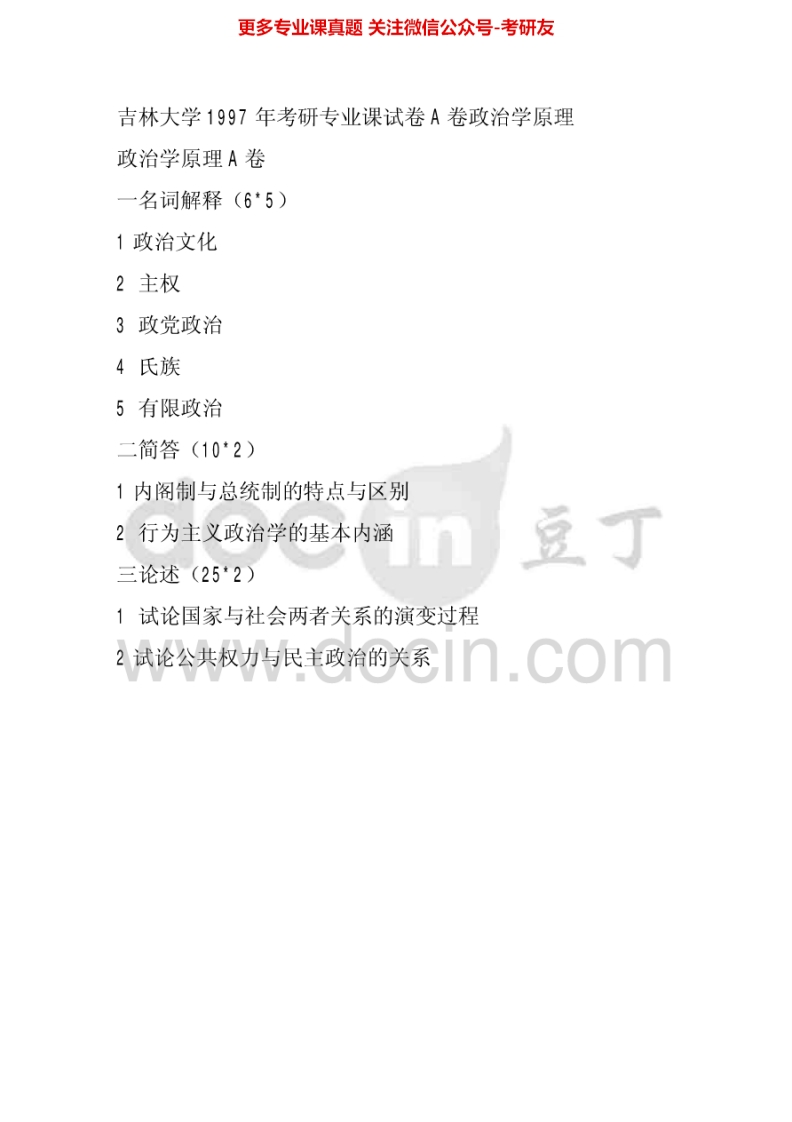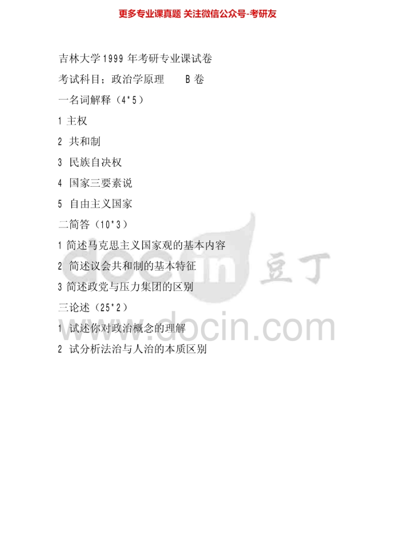 吉林大学694政治学原理(含政治学理论、国际关系理论)1996-1997、1999-2002考研真题汇编猴哥6个月前发布关注私信0.30MB6页08152吉林大学694政治学原理(含政治学理论、国际关系理论)1996-1997、1999-2002考研真题汇编此内容为免费资源,请登录后查看¥0 登录查看免费资源 第1页 / 共6页 第2页 / 共6页 第3页 / 共6页 该文档为免费文档,您可直接下载完整版进行阅读 © 版权声明文章版权归作者所有,未经允许请勿转载。THE END《吉林大学》(694)政治学概论与国际关系理论考研资料考研专业课 喜欢就支持一下吧点赞52赞赏 分享QQ空间微博QQ好友海报分享复制链接收藏