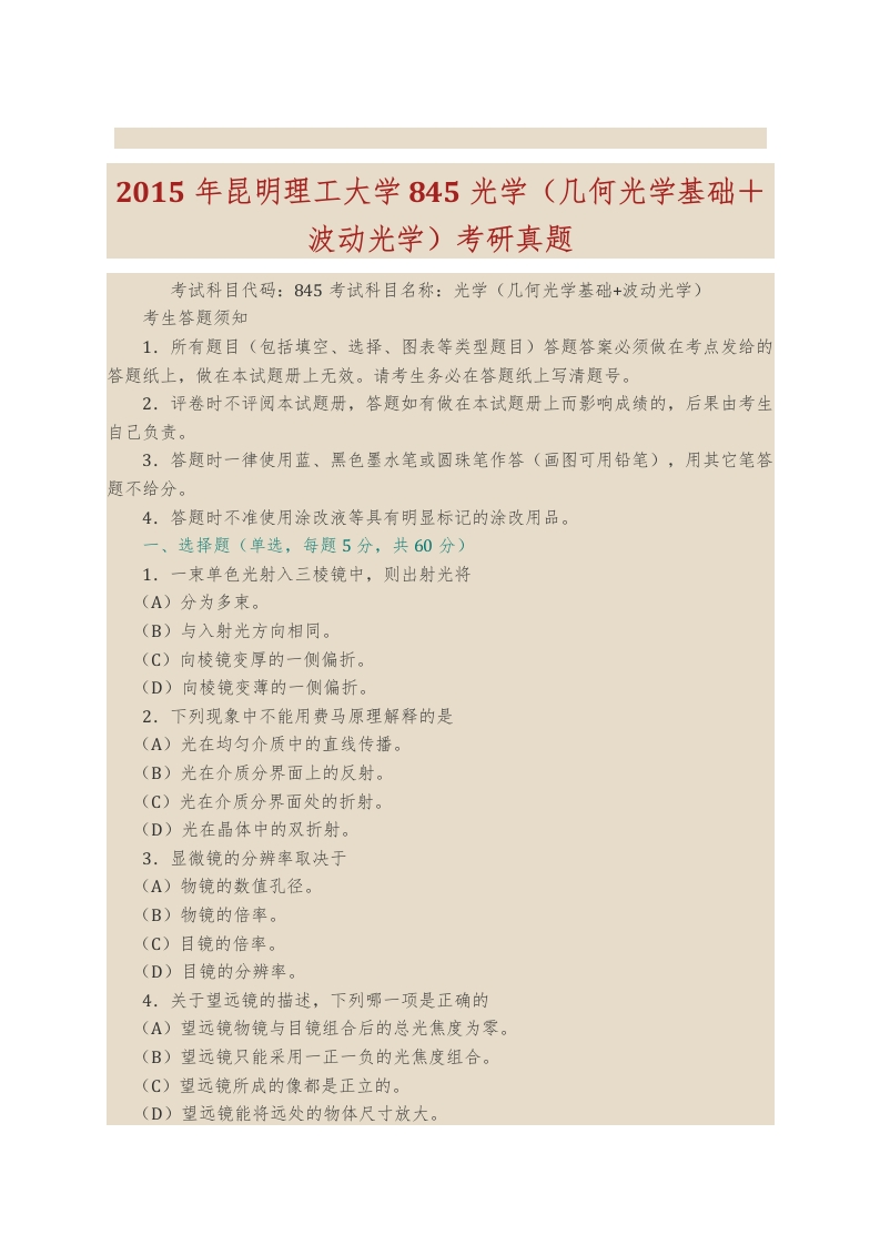 昆明理工大学理学院845光学(几何光学基础+波动光学)历年考研真题汇编猴哥6个月前发布关注私信0.53MB53页05556昆明理工大学理学院845光学(几何光学基础+波动光学)历年考研真题汇编此内容为免费资源,请登录后查看¥0 登录查看免费资源 第1页 / 共53页 第2页 / 共53页 第3页 / 共53页 该文档为免费文档,您可直接下载完整版进行阅读 © 版权声明文章版权归作者所有,未经允许请勿转载。THE END《昆明理工大学》(845)光学(几何光学基础+波动光学)考研资料考研专业课 喜欢就支持一下吧点赞56赞赏 分享QQ空间微博QQ好友海报分享复制链接收藏