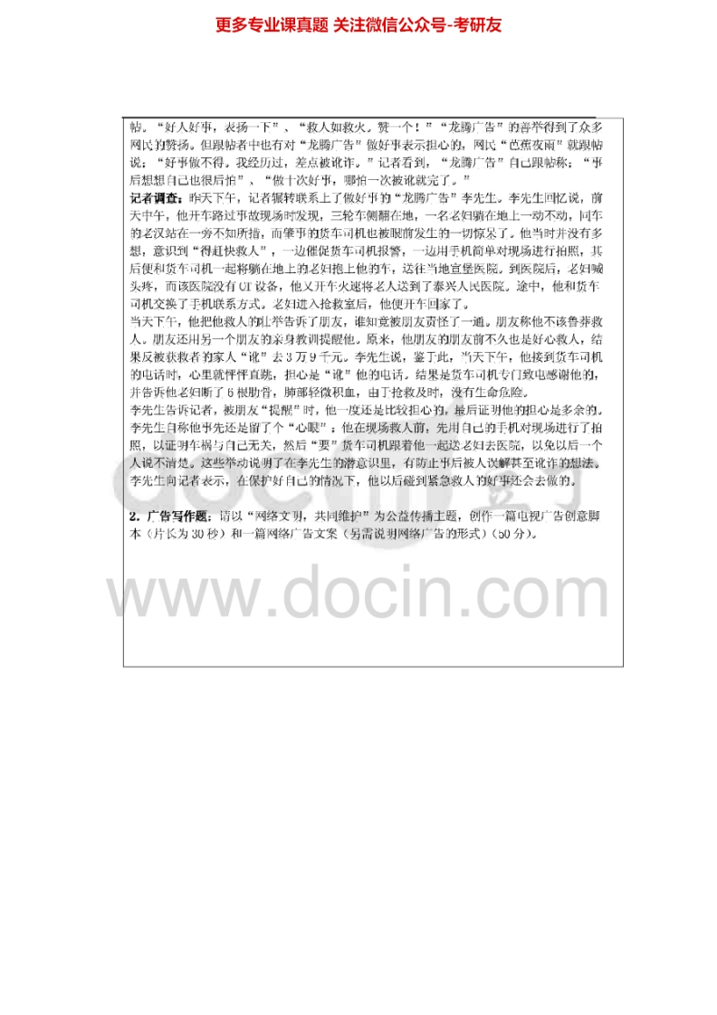 暨南大学334新闻与传播专业综合能力2011-2012、2014考研真题汇编.Image.Marked猴哥6个月前发布关注私信0.85MB8页04432暨南大学334新闻与传播专业综合能力2011-2012、2014考研真题汇编.Image.Marked此内容为免费资源,请登录后查看¥0 登录查看免费资源 第1页 / 共8页 第2页 / 共8页 第3页 / 共8页 该文档为免费文档,您可直接下载完整版进行阅读 © 版权声明文章版权归作者所有,未经允许请勿转载。THE END《暨南大学》(334)新闻与传播专业综合能力考研资料考研专业课 喜欢就支持一下吧点赞32赞赏 分享QQ空间微博QQ好友海报分享复制链接收藏