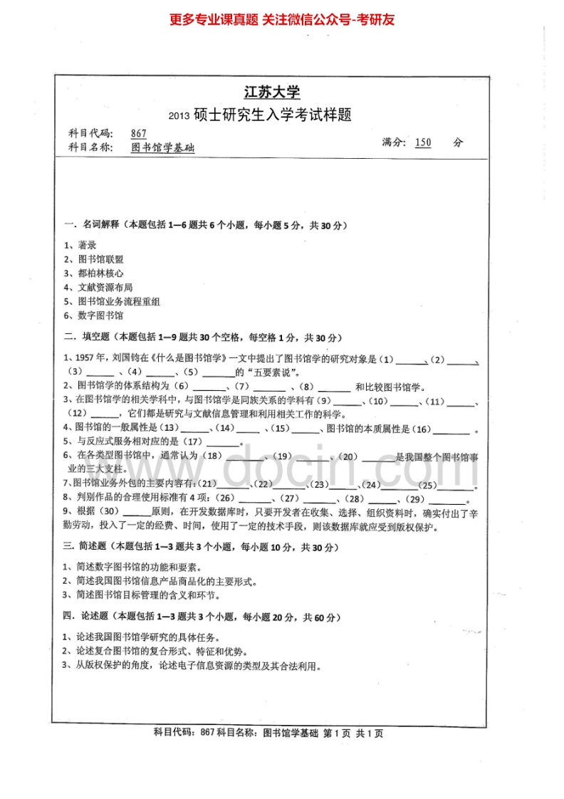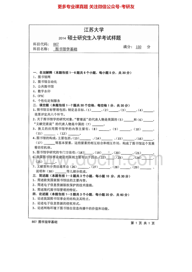 江苏大学867图书馆学基础2012-2015考研真题汇编猴哥6个月前发布关注私信1.23MB5页05933江苏大学867图书馆学基础2012-2015考研真题汇编此内容为免费资源,请登录后查看¥0 登录查看免费资源 第1页 / 共5页 第2页 / 共5页 第3页 / 共5页 该文档为免费文档,您可直接下载完整版进行阅读 © 版权声明文章版权归作者所有,未经允许请勿转载。THE END考研专业课 喜欢就支持一下吧点赞33赞赏 分享QQ空间微博QQ好友海报分享复制链接收藏