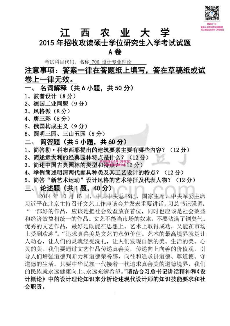 江西农业大学707设计专业理论2014-2015考研真题汇编微信公众号微研社免费分享