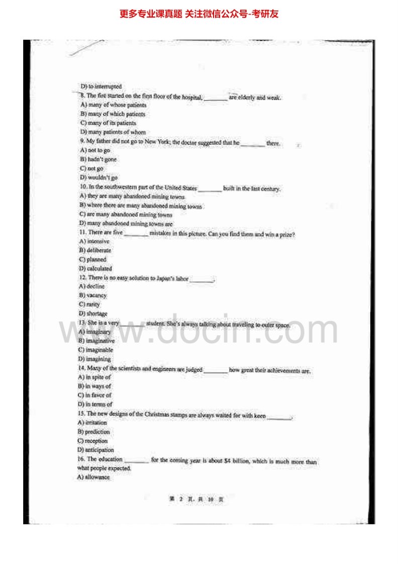 江西师范大学245英语2012-2015考研真题汇编猴哥6个月前发布关注私信18.38MB50页08321江西师范大学245英语2012-2015考研真题汇编此内容为免费资源,请登录后查看¥0 登录查看免费资源 第1页 / 共50页 第2页 / 共50页 第3页 / 共50页 该文档为免费文档,您可直接下载完整版进行阅读 © 版权声明文章版权归作者所有,未经允许请勿转载。THE END考研专业课 喜欢就支持一下吧点赞21赞赏 分享QQ空间微博QQ好友海报分享复制链接收藏