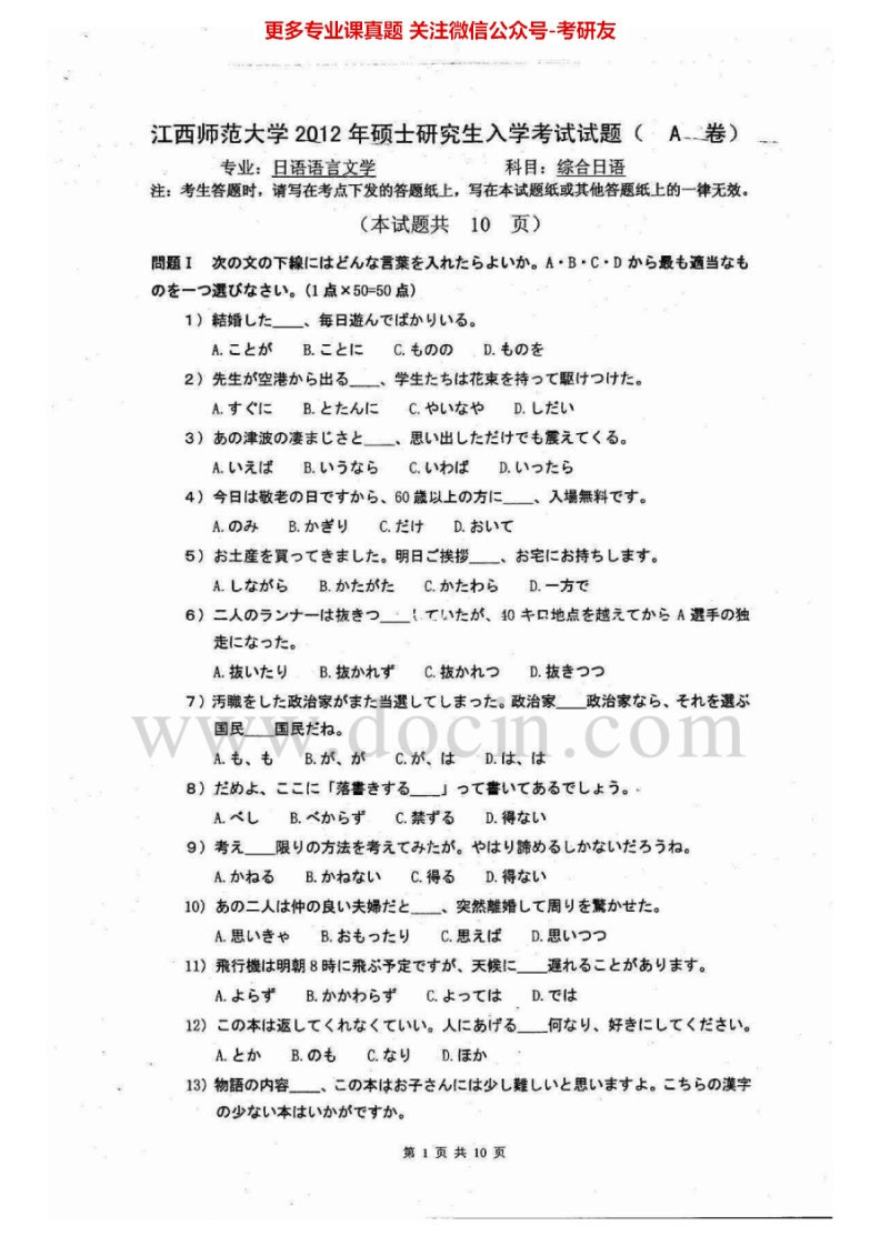 江西师范大学717综合日语2012-2015考研真题汇编-学习资源网 - 分享优质学习资料