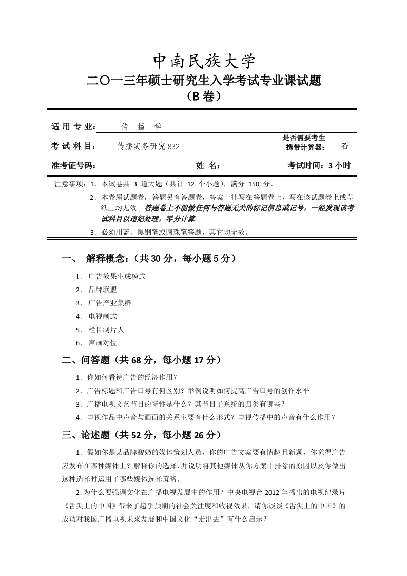 中南民族大学832传播实务研究考研真题-学习资源网 - 分享优质学习资料