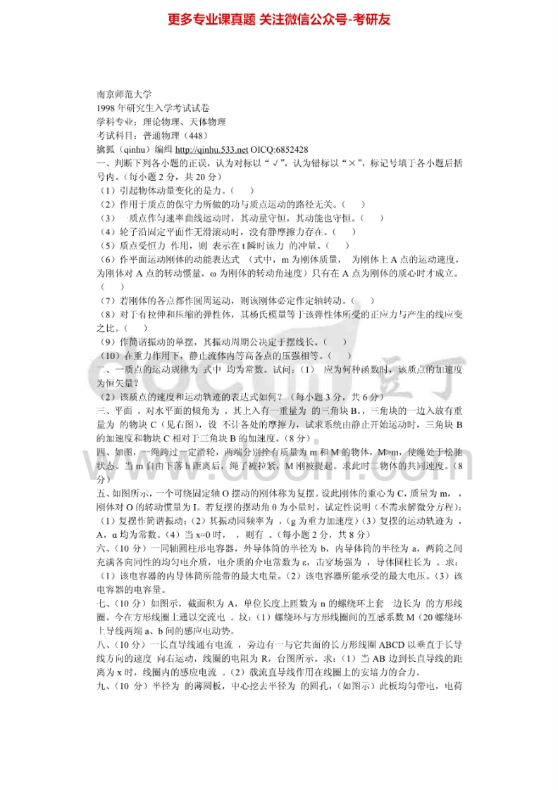 南京师范大学普通物理(力学、电磁学部分)1997-2009、2011-2014汇编考研真题考研真题汇编.Image.Marked猴哥6个月前发布关注私信16.64MB63页07747南京师范大学普通物理(力学、电磁学部分)1997-2009、2011-2014汇编考研真题考研真题汇编.Image.Marked此内容为免费资源,请登录后查看¥0 登录查看免费资源 第1页 / 共63页 第2页 / 共63页 第3页 / 共63页 该文档为免费文档,您可直接下载完整版进行阅读 © 版权声明文章版权归作者所有,未经允许请勿转载。THE END考研专业课 喜欢就支持一下吧点赞47赞赏 分享QQ空间微博QQ好友海报分享复制链接收藏