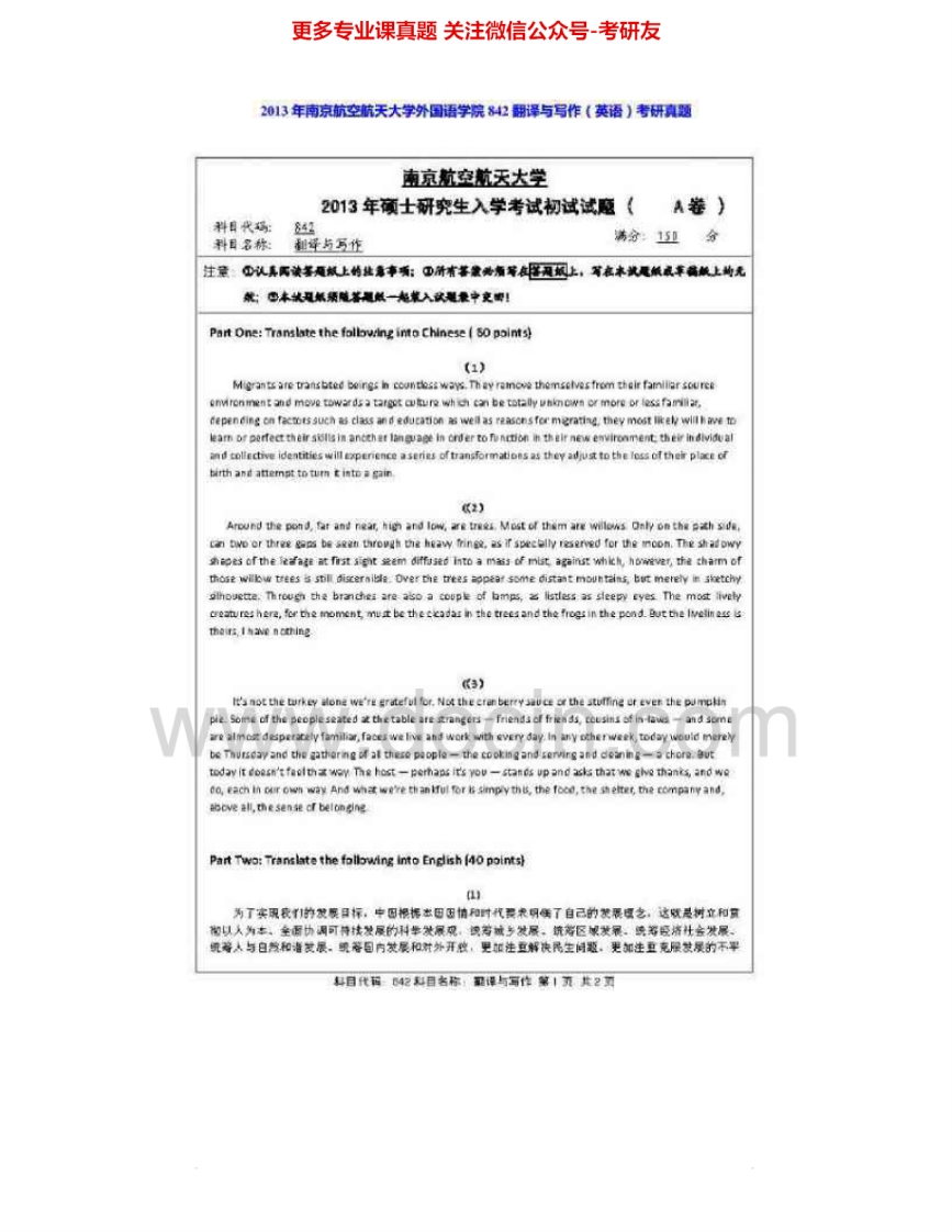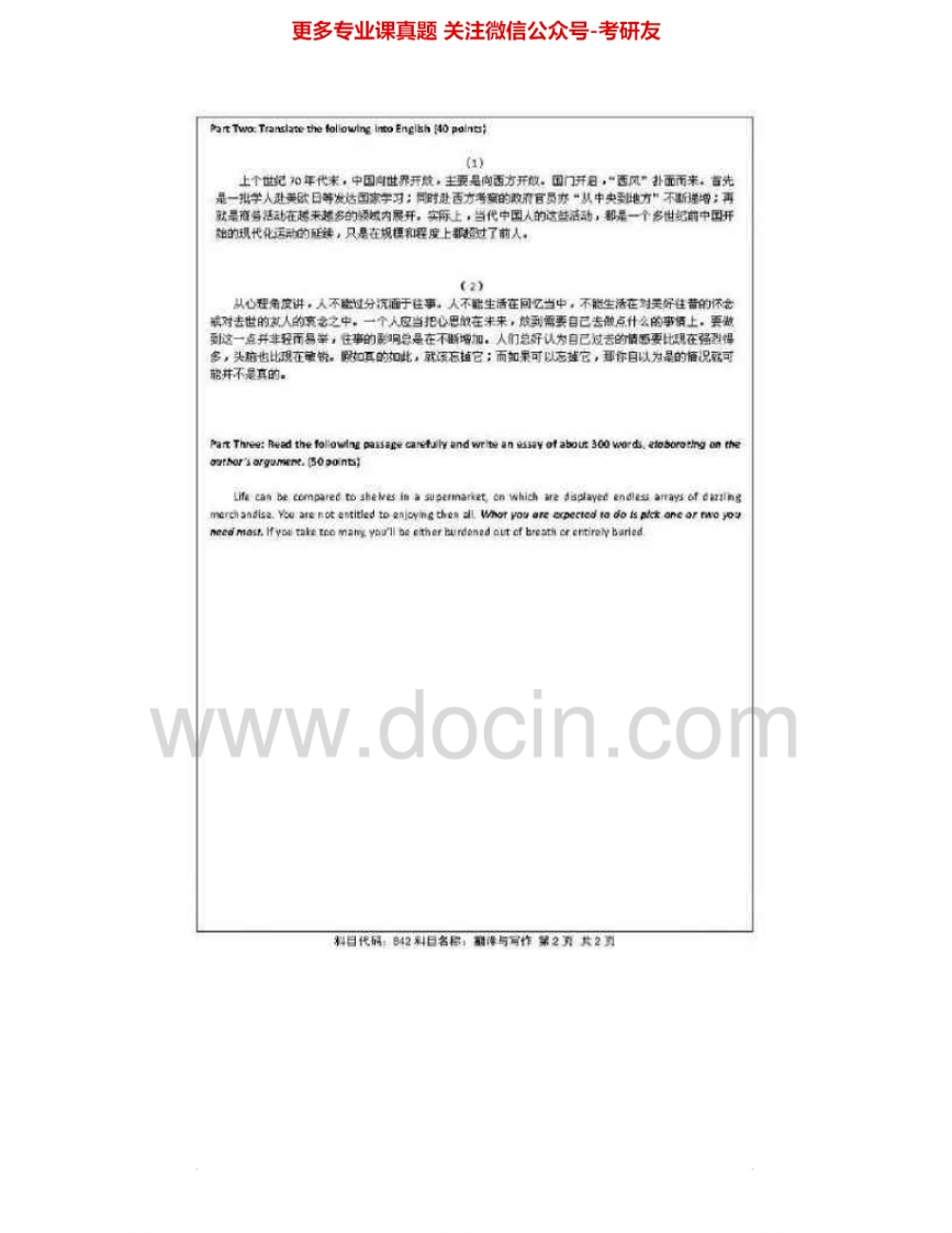 南京航空航天大学842翻译与写作(英语)2004-2010、2012-2015考研真题汇编.Image.Marked猴哥6个月前发布关注私信8.96MB29页06834南京航空航天大学842翻译与写作(英语)2004-2010、2012-2015考研真题汇编.Image.Marked此内容为免费资源,请登录后查看¥0 登录查看免费资源 第1页 / 共29页 第2页 / 共29页 第3页 / 共29页 该文档为免费文档,您可直接下载完整版进行阅读 © 版权声明文章版权归作者所有,未经允许请勿转载。THE END《南京航空航天大学》(842)翻译与写作(英语)考研资料考研专业课 喜欢就支持一下吧点赞34赞赏 分享QQ空间微博QQ好友海报分享复制链接收藏