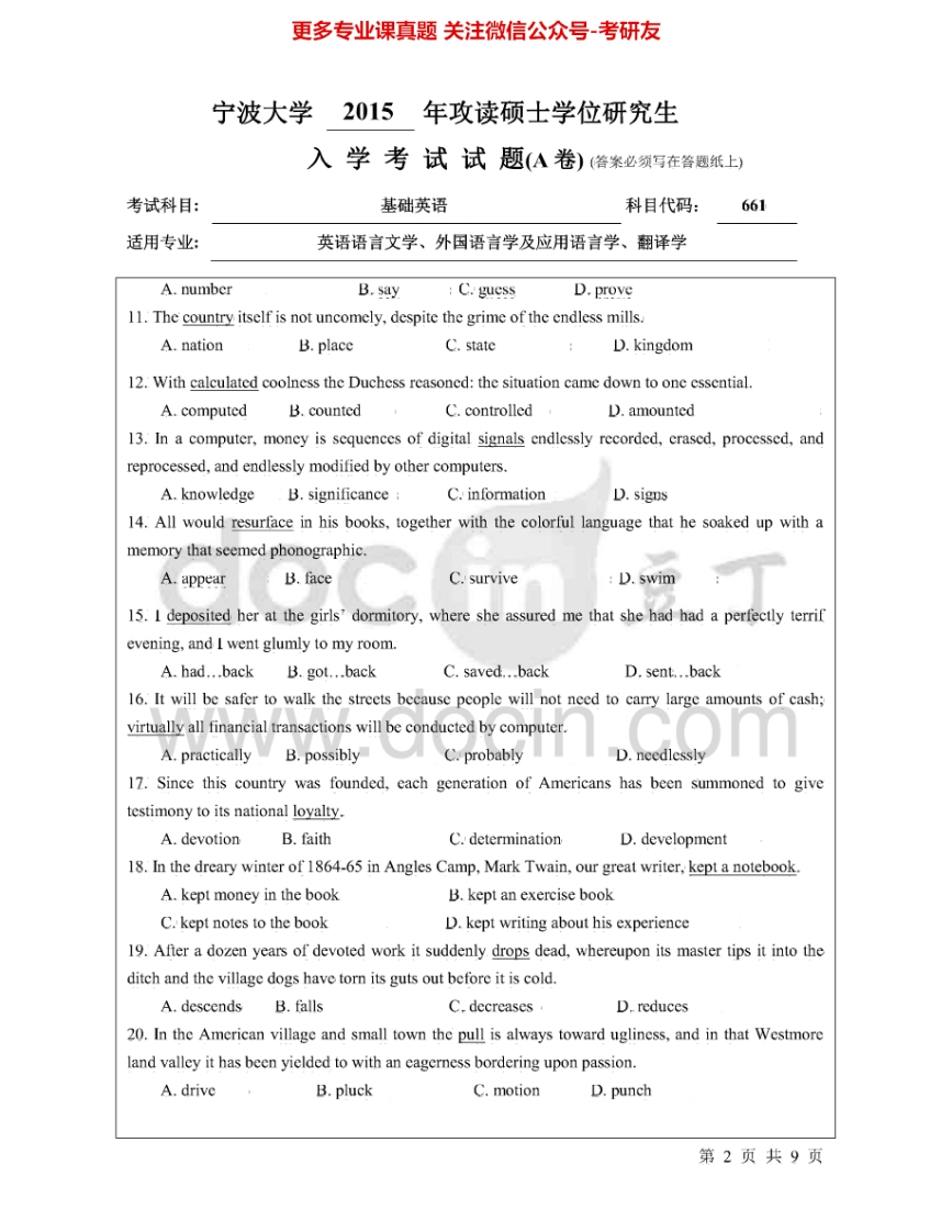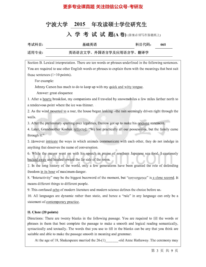 宁波大学661基础英语2004-2015其中2007-2008、2013有答案考研真题汇编.Image.Marked猴哥6个月前发布关注私信29.30MB102页08958宁波大学661基础英语2004-2015其中2007-2008、2013有答案考研真题汇编.Image.Marked此内容为免费资源,请登录后查看¥0 登录查看免费资源 第1页 / 共102页 第2页 / 共102页 第3页 / 共102页 该文档为免费文档,您可直接下载完整版进行阅读 © 版权声明文章版权归作者所有,未经允许请勿转载。THE END《宁波大学》(661)基础英语考研资料考研专业课 喜欢就支持一下吧点赞58赞赏 分享QQ空间微博QQ好友海报分享复制链接收藏