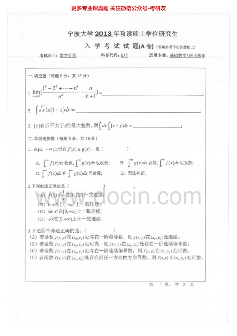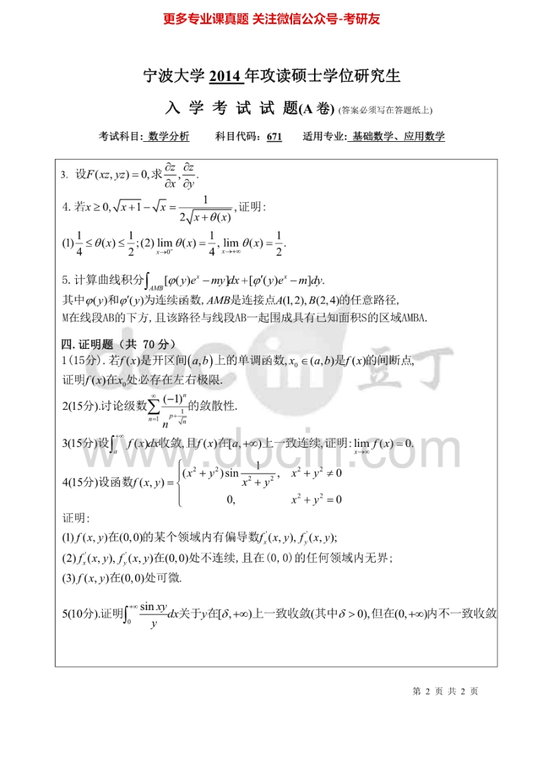 宁波大学数学分析2004-20142007-2009有答案考研真题汇编.Image.Marked猴哥6个月前发布关注私信10.15MB43页06137宁波大学数学分析2004-20142007-2009有答案考研真题汇编.Image.Marked此内容为免费资源,请登录后查看¥0 登录查看免费资源 第1页 / 共43页 第2页 / 共43页 第3页 / 共43页 该文档为免费文档,您可直接下载完整版进行阅读 © 版权声明文章版权归作者所有,未经允许请勿转载。THE END考研专业课 喜欢就支持一下吧点赞37赞赏 分享QQ空间微博QQ好友海报分享复制链接收藏
