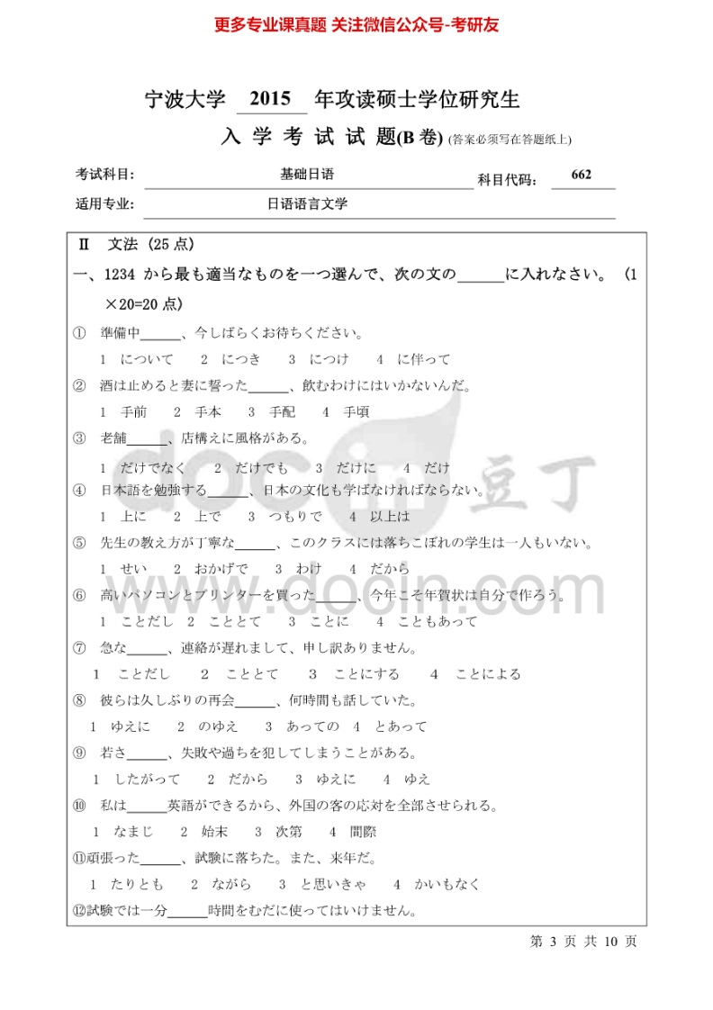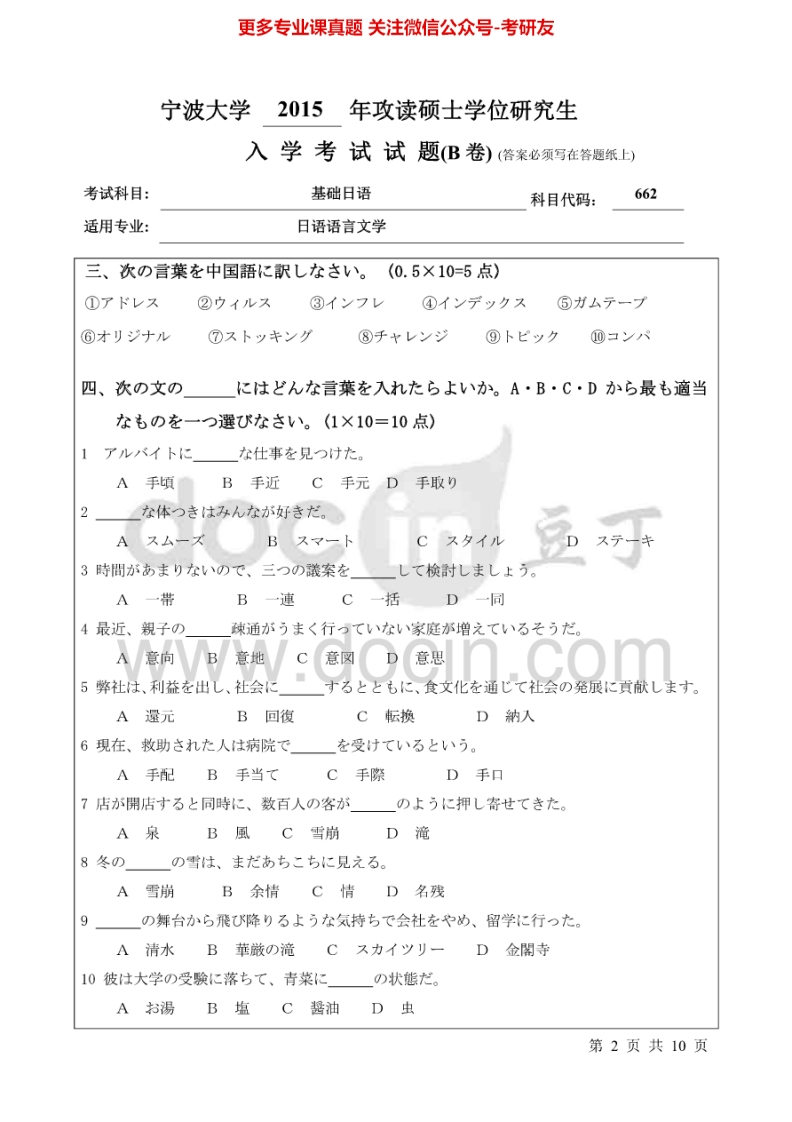 宁波大学基础日语2007-2015其中2007-2009有答案考研真题汇编.Image.Marked猴哥6个月前发布关注私信20.19MB82页07528宁波大学基础日语2007-2015其中2007-2009有答案考研真题汇编.Image.Marked此内容为免费资源,请登录后查看¥0 登录查看免费资源 第1页 / 共82页 第2页 / 共82页 第3页 / 共82页 该文档为免费文档,您可直接下载完整版进行阅读 © 版权声明文章版权归作者所有,未经允许请勿转载。THE END考研专业课 喜欢就支持一下吧点赞28赞赏 分享QQ空间微博QQ好友海报分享复制链接收藏