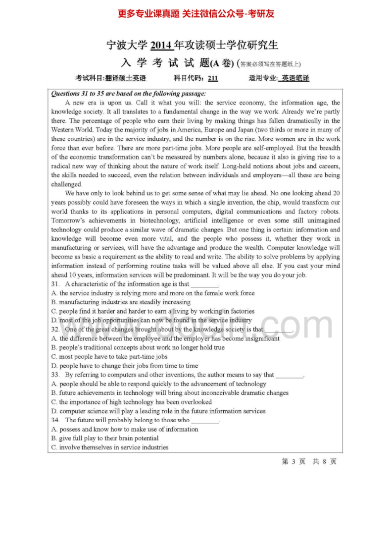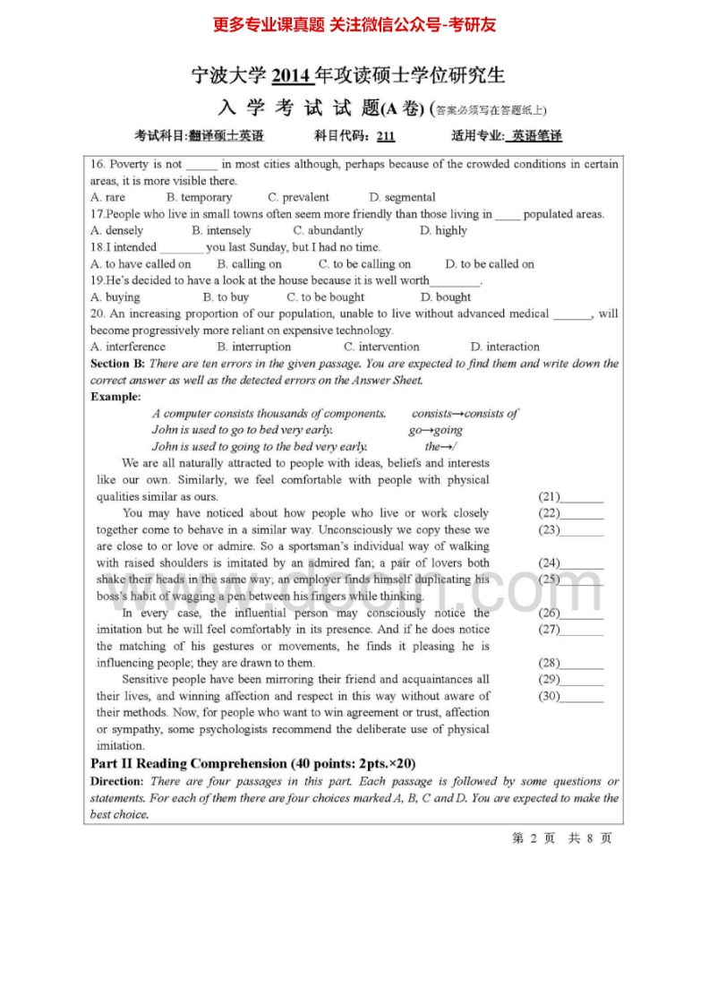 宁波大学外语学院211翻译硕士英语[专业硕士]2011-2014考研真题汇编.Image.Marked猴哥6个月前发布关注私信13.15MB40页09133宁波大学外语学院211翻译硕士英语[专业硕士]2011-2014考研真题汇编.Image.Marked此内容为免费资源,请登录后查看¥0 登录查看免费资源 第1页 / 共40页 第2页 / 共40页 第3页 / 共40页 该文档为免费文档,您可直接下载完整版进行阅读 © 版权声明文章版权归作者所有,未经允许请勿转载。THE END考研专业课 喜欢就支持一下吧点赞33赞赏 分享QQ空间微博QQ好友海报分享复制链接收藏