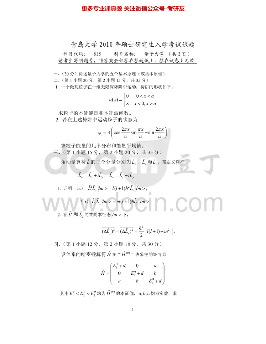 青岛大学815量子力学2009-2015考研真题汇编猴哥6个月前发布关注私信0.60MB11页06439青岛大学815量子力学2009-2015考研真题汇编此内容为免费资源,请登录后查看¥0 登录查看免费资源 第1页 / 共11页 第2页 / 共11页 第3页 / 共11页 该文档为免费文档,您可直接下载完整版进行阅读 © 版权声明文章版权归作者所有,未经允许请勿转载。THE END《青岛大学》(815)量子力学考研资料考研专业课 喜欢就支持一下吧点赞39赞赏 分享QQ空间微博QQ好友海报分享复制链接收藏