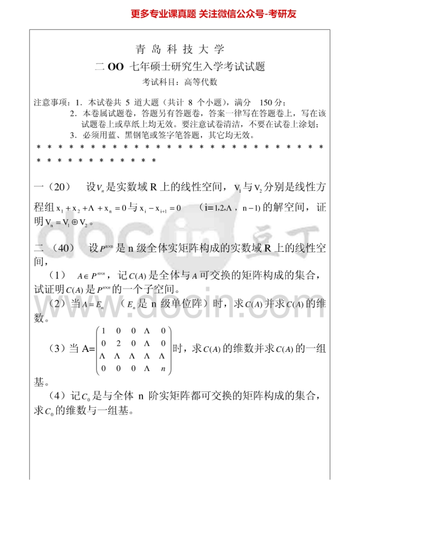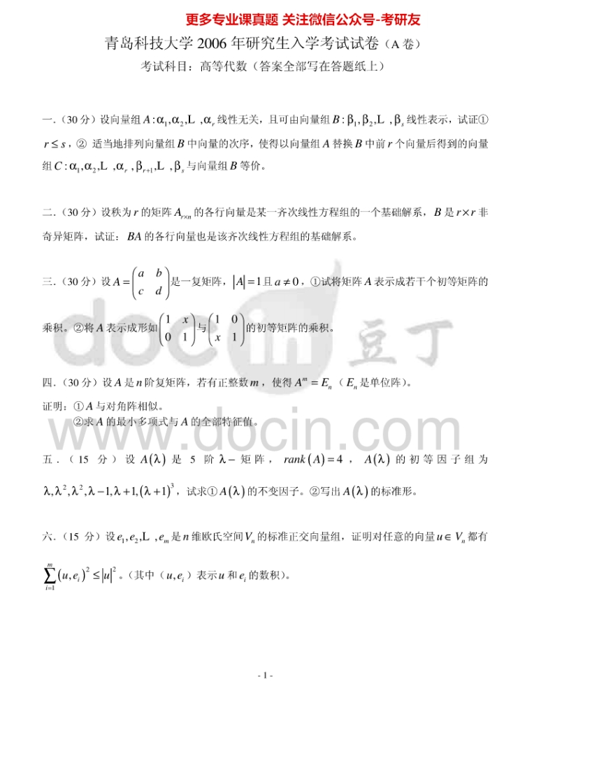 青岛科技大学860高等代数2005-2012考研真题汇编.Image.Marked猴哥6个月前发布关注私信0.77MB14页06133青岛科技大学860高等代数2005-2012考研真题汇编.Image.Marked此内容为免费资源,请登录后查看¥0 登录查看免费资源 第1页 / 共14页 第2页 / 共14页 第3页 / 共14页 该文档为免费文档,您可直接下载完整版进行阅读 © 版权声明文章版权归作者所有,未经允许请勿转载。THE END考研专业课 喜欢就支持一下吧点赞33赞赏 分享QQ空间微博QQ好友海报分享复制链接收藏