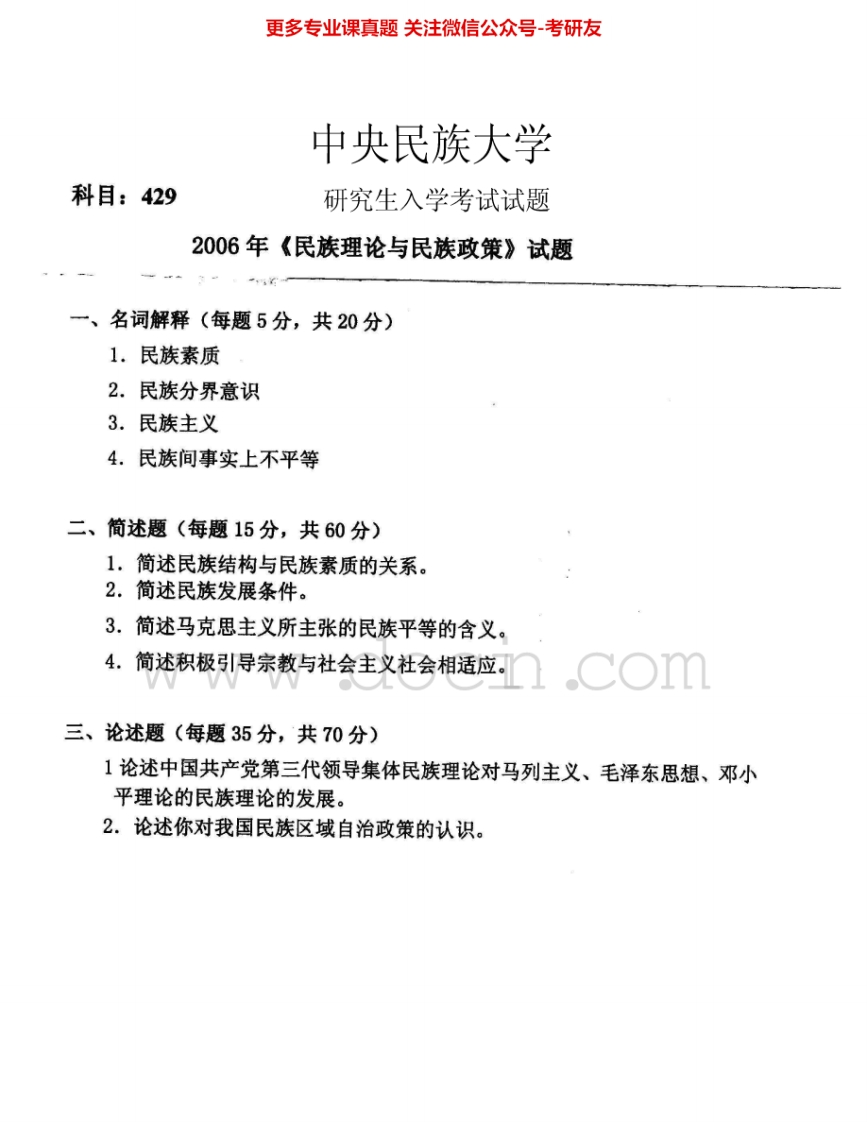 中央民族大学823民族理论与民族政策2005-2006考研真题汇编猴哥6个月前发布关注私信0.51MB2页08758中央民族大学823民族理论与民族政策2005-2006考研真题汇编此内容为免费资源,请登录后查看¥0 登录查看免费资源 第1页 / 共2页 第2页 / 共2页 已完成全部阅读,共2页 © 版权声明文章版权归作者所有,未经允许请勿转载。THE END《中央民族大学》(823)民族理论与民族政策考研资料考研专业课 喜欢就支持一下吧点赞58赞赏 分享QQ空间微博QQ好友海报分享复制链接收藏
