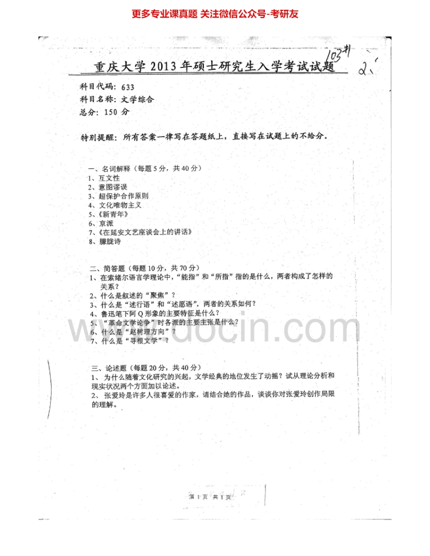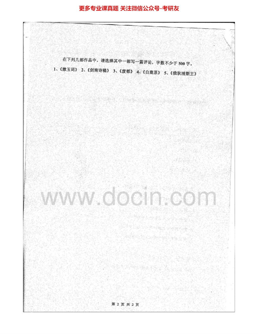 重庆大学633文学综合2012-2015考研真题汇编猴哥6个月前发布关注私信2.62MB8页03060重庆大学633文学综合2012-2015考研真题汇编此内容为免费资源,请登录后查看¥0 登录查看免费资源 第1页 / 共8页 第2页 / 共8页 第3页 / 共8页 该文档为免费文档,您可直接下载完整版进行阅读 © 版权声明文章版权归作者所有,未经允许请勿转载。THE END《重庆大学》(633)语言文学综合考研资料考研专业课 喜欢就支持一下吧点赞60赞赏 分享QQ空间微博QQ好友海报分享复制链接收藏