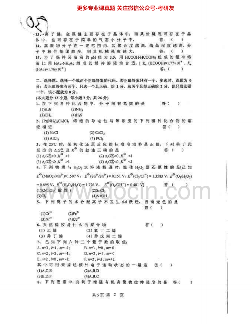 重庆大学625化学综合2004-2005、2007-2010考研真题汇编猴哥6个月前发布关注私信9.45MB31页04621重庆大学625化学综合2004-2005、2007-2010考研真题汇编此内容为免费资源,请登录后查看¥0 登录查看免费资源 第1页 / 共31页 第2页 / 共31页 第3页 / 共31页 该文档为免费文档,您可直接下载完整版进行阅读 © 版权声明文章版权归作者所有,未经允许请勿转载。THE END《重庆大学》(625)化学综合考研资料考研专业课 喜欢就支持一下吧点赞21赞赏 分享QQ空间微博QQ好友海报分享复制链接收藏