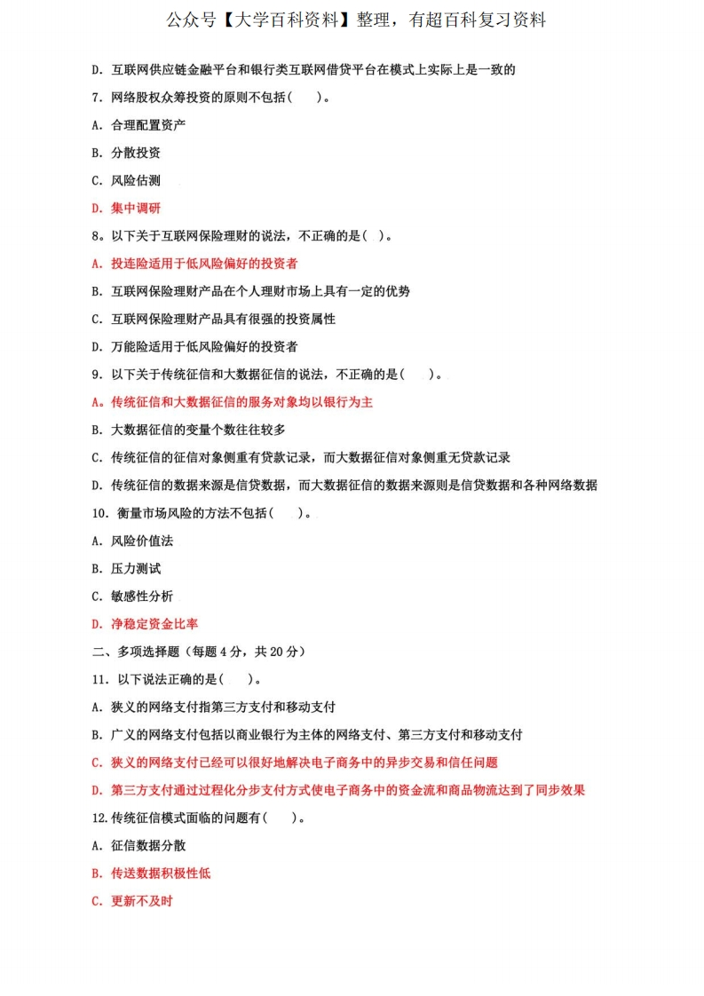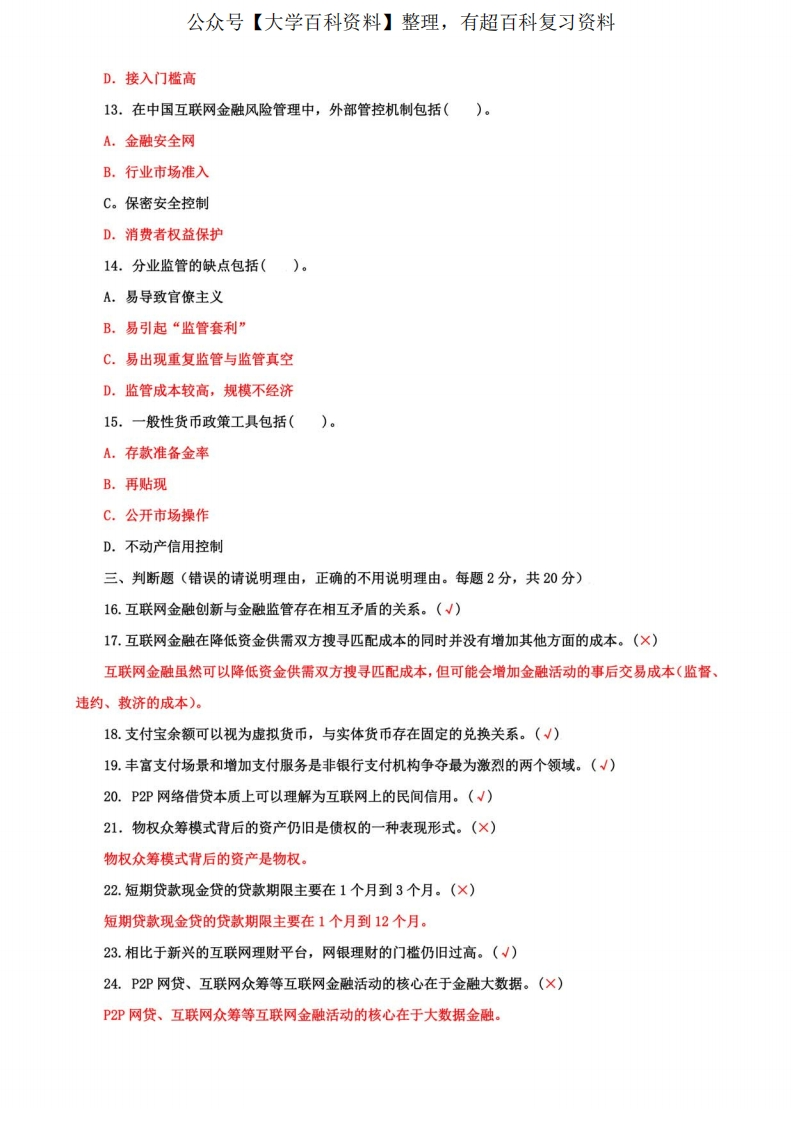 最新国开电大专科《互联网金融概论》期末试题及答案(卷号3998)猴哥6个月前发布关注私信2.92MB7页05733最新国开电大专科《互联网金融概论》期末试题及答案(卷号3998)此内容为免费资源,请登录后查看¥0 登录查看免费资源 第1页 / 共7页 第2页 / 共7页 第3页 / 共7页 该文档为免费文档,您可直接下载完整版进行阅读 © 版权声明文章版权归作者所有,未经允许请勿转载。THE END期末复习 喜欢就支持一下吧点赞33赞赏 分享QQ空间微博QQ好友海报分享复制链接收藏
