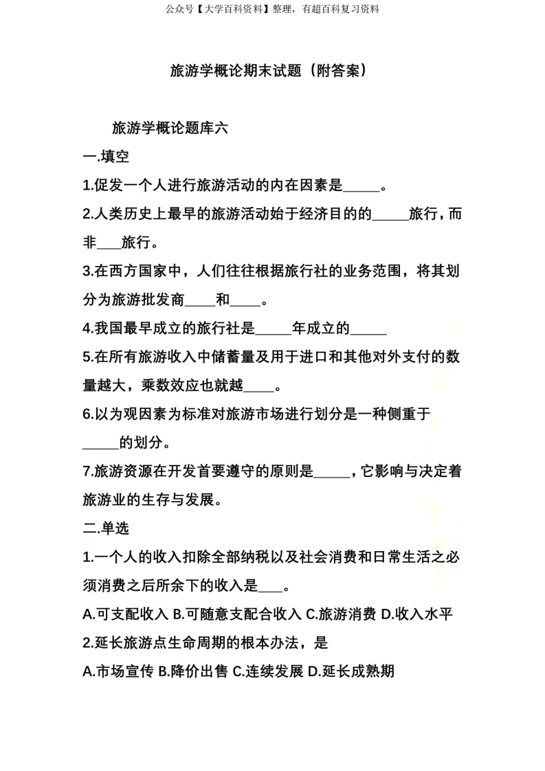 旅游学概论期末试题(附答案)猴哥6个月前发布关注私信1.15MB10页05626旅游学概论期末试题(附答案)此内容为免费资源,请登录后查看¥0 登录查看免费资源 第1页 / 共10页 第2页 / 共10页 第3页 / 共10页 该文档为免费文档,您可直接下载完整版进行阅读 © 版权声明文章版权归作者所有,未经允许请勿转载。THE END期末复习 喜欢就支持一下吧点赞26赞赏 分享QQ空间微博QQ好友海报分享复制链接收藏
