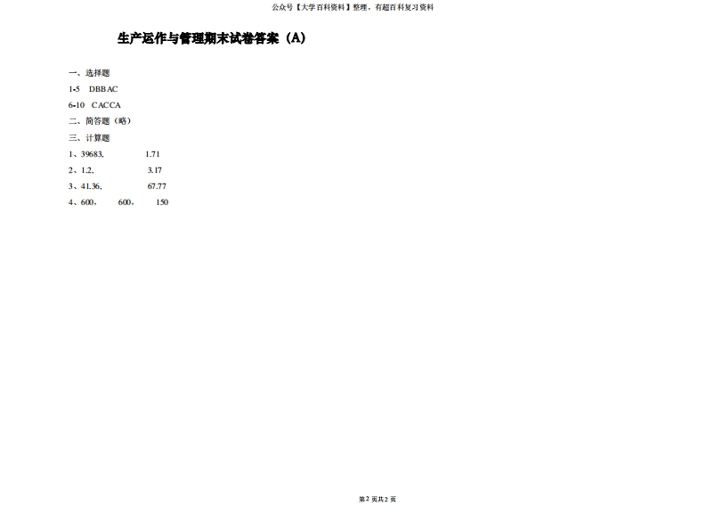 《生产运作与管理》期末试卷及答案(A)猴哥6个月前发布关注私信0.11MB2页08449《生产运作与管理》期末试卷及答案(A)此内容为免费资源,请登录后查看¥0 登录查看免费资源 第1页 / 共2页 第2页 / 共2页 已完成全部阅读,共2页 © 版权声明文章版权归作者所有,未经允许请勿转载。THE END期末复习 喜欢就支持一下吧点赞49赞赏 分享QQ空间微博QQ好友海报分享复制链接收藏