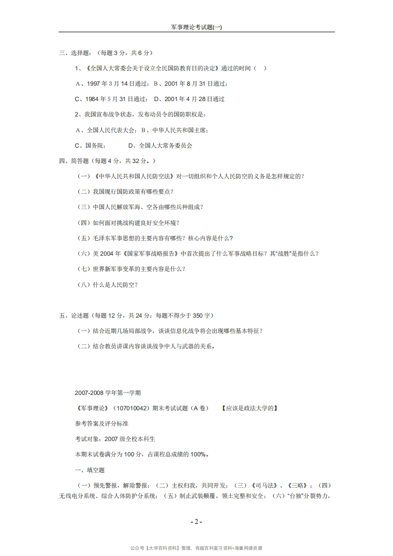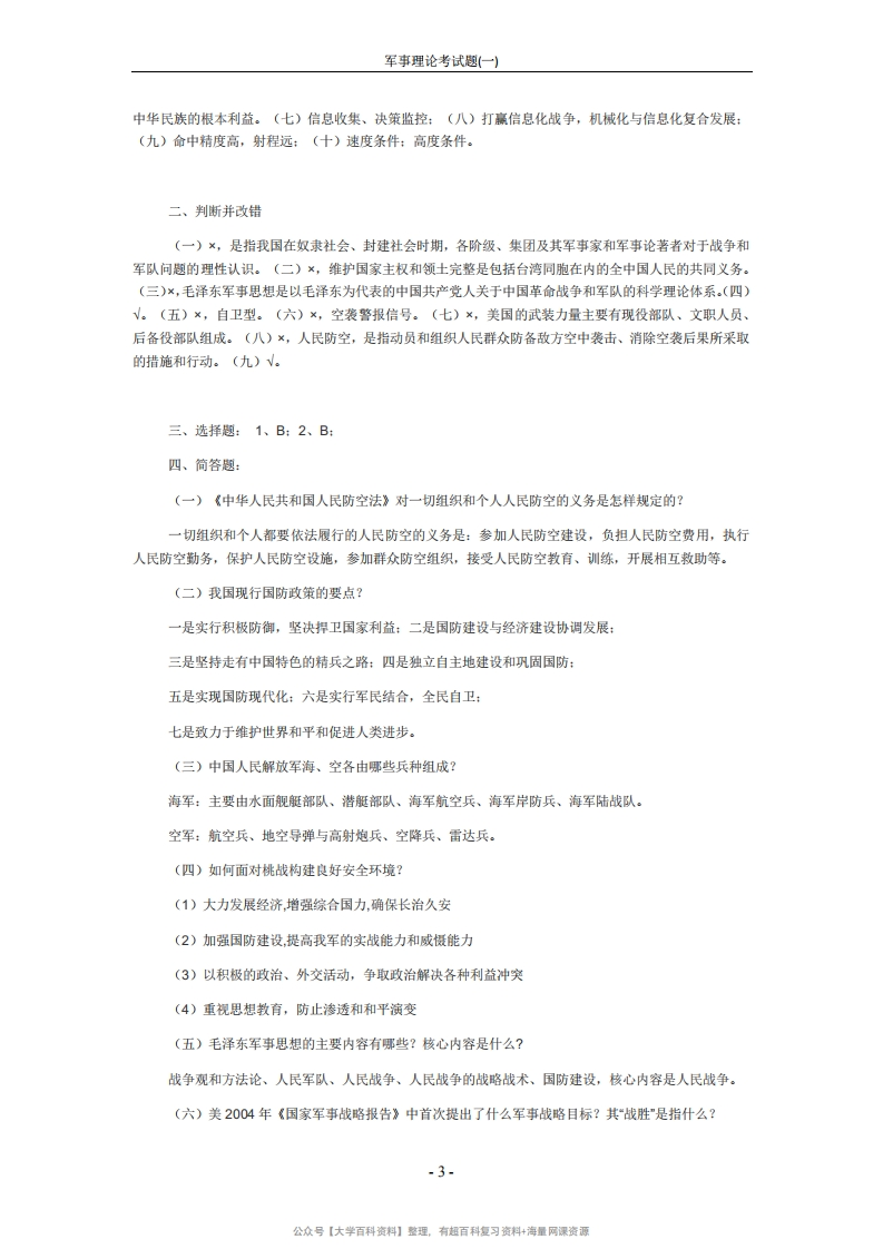 军事理论考试题(一)猴哥6个月前发布关注私信0.12MB4页04413军事理论考试题(一)此内容为免费资源,请登录后查看¥0 登录查看免费资源 第1页 / 共4页 第2页 / 共4页 第3页 / 共4页 该文档为免费文档,您可直接下载完整版进行阅读 © 版权声明文章版权归作者所有,未经允许请勿转载。THE END期末复习 喜欢就支持一下吧点赞13赞赏 分享QQ空间微博QQ好友海报分享复制链接收藏